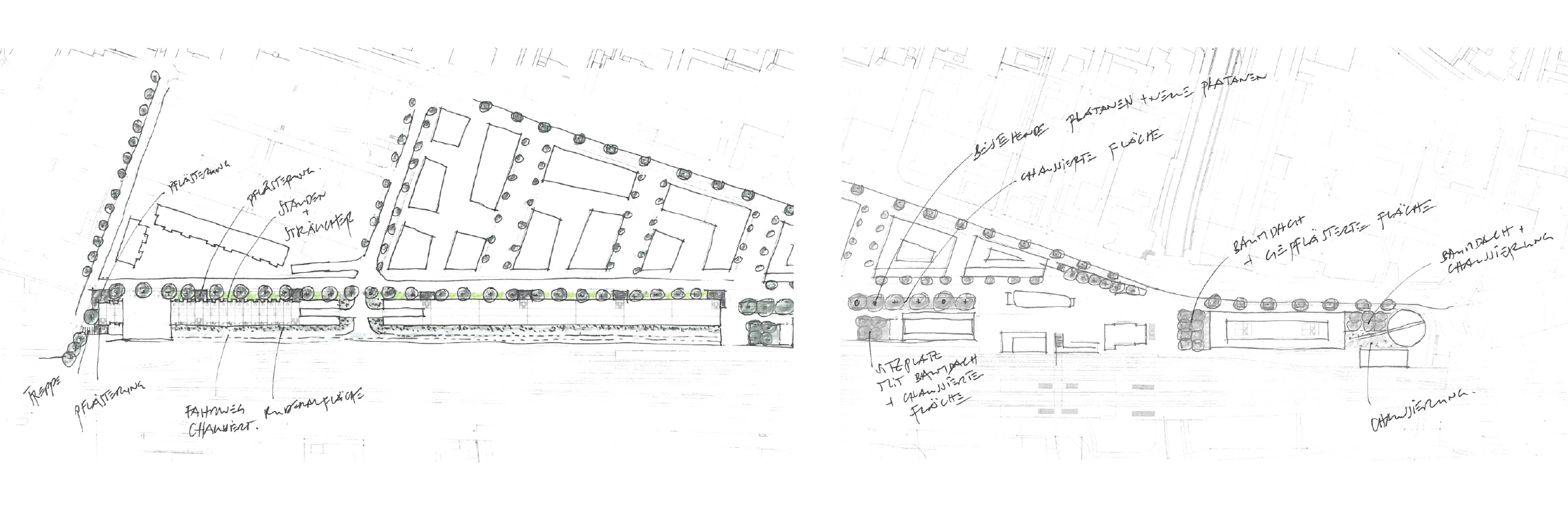 Der bestehende Ortbetondeckel des Bahnhofplatzes wird durch sein neues Umfeld zum robusten Kern und Angelpunkt des neuen Bahnhofareals. Verschiedene Baumgruppen und Belagsflächen geben dem Platz einen Rahmen und bieten Schatten.