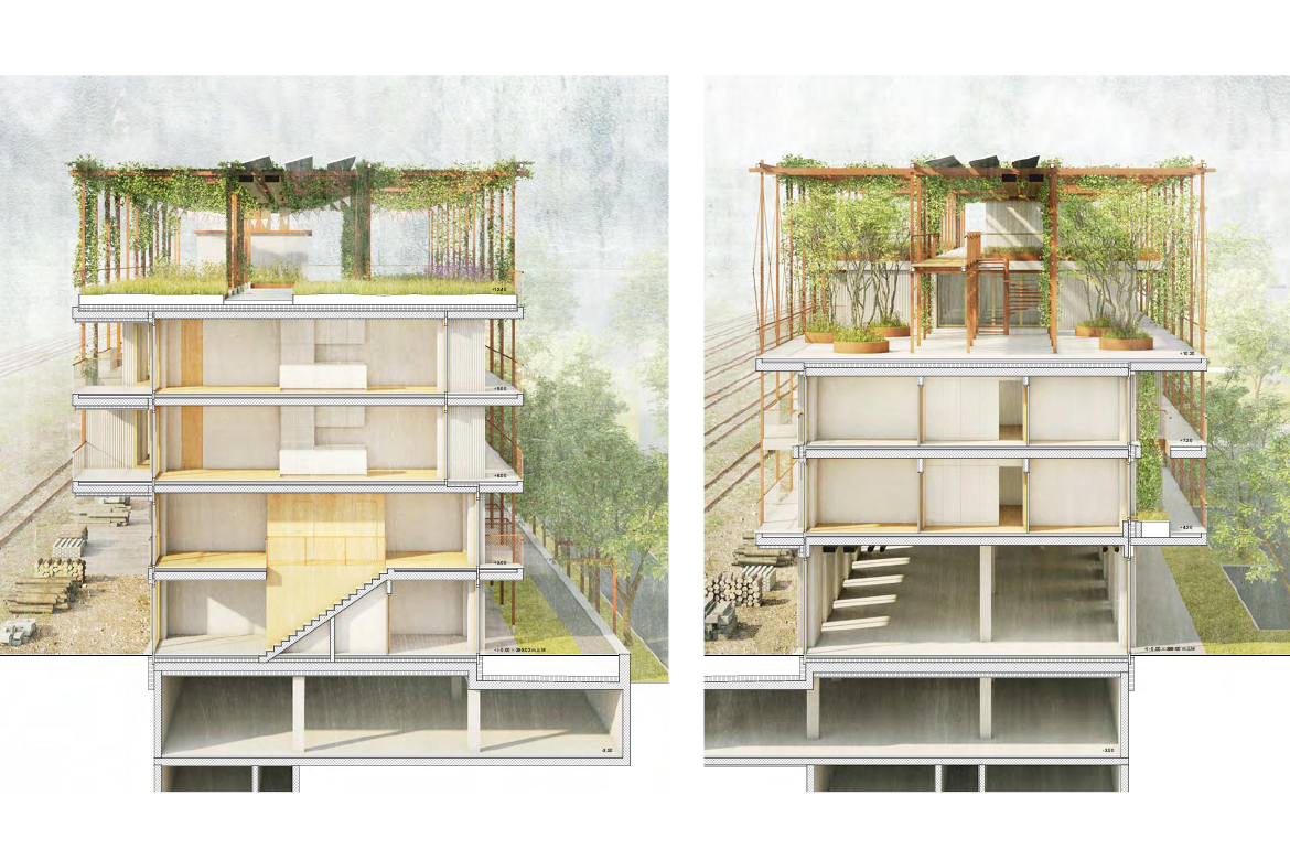 Die neuen Wohn- und Gewerbebauten gliedern sich an die Bahnlinie an. Adressbildende Merkmale der neuen Bauten sind die Dachgärten, die tiefen Fassadenschichten mit Laubengängen und Balkonen bei den beiden Wohnbauten. Weil Freiraum in dieser baulichen Dichte Mangelware ist, wandert der Aussenraum für die Anwohner auf die Dächer. Sie werden als zusammenhängende, gemeinschaftliche Dachgärten ausgebildet und bieten Aufenthaltsorte, Spielflächen, grosszügige Grünflächen mit Stauden und Kleingehölzen.