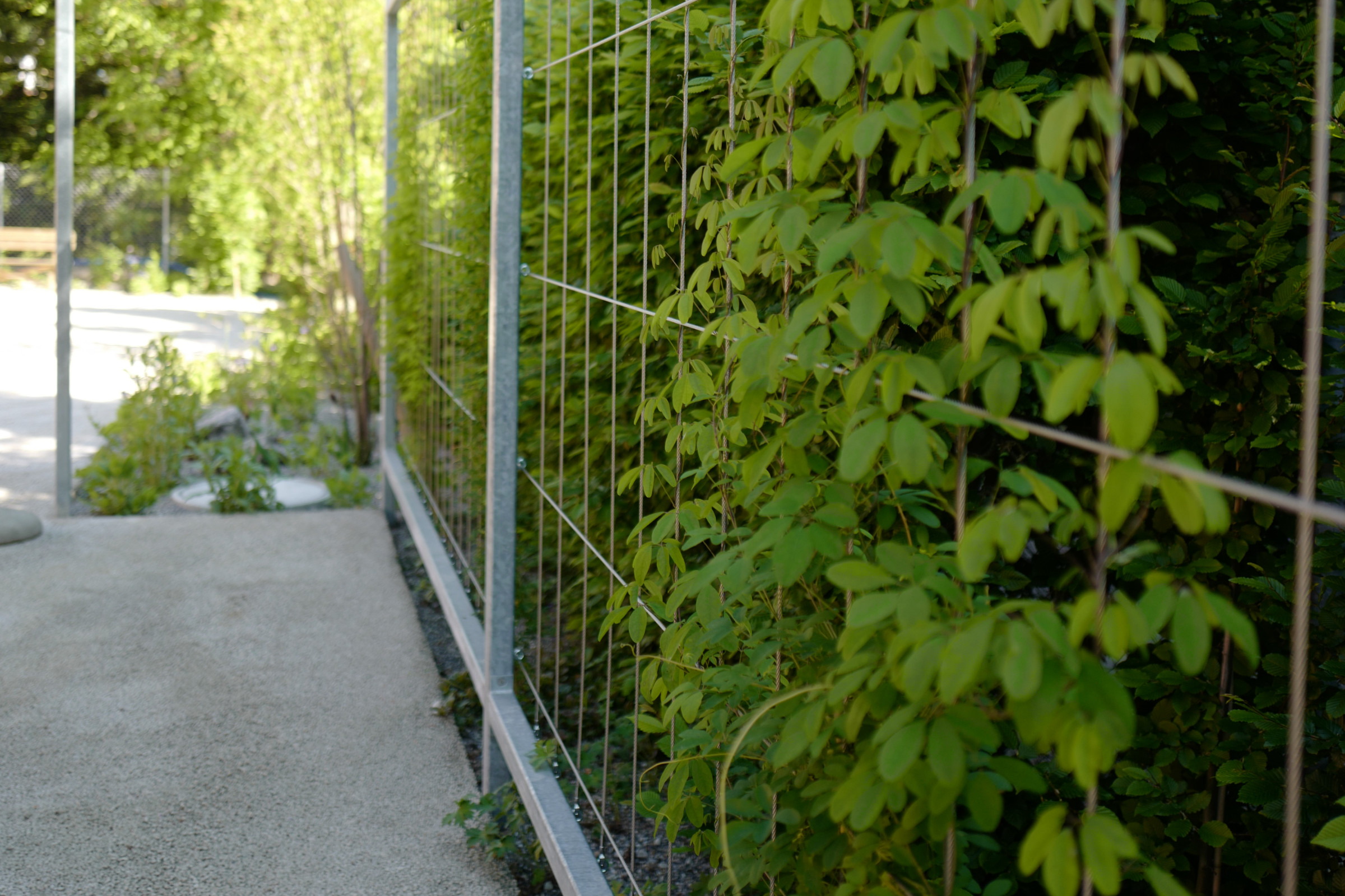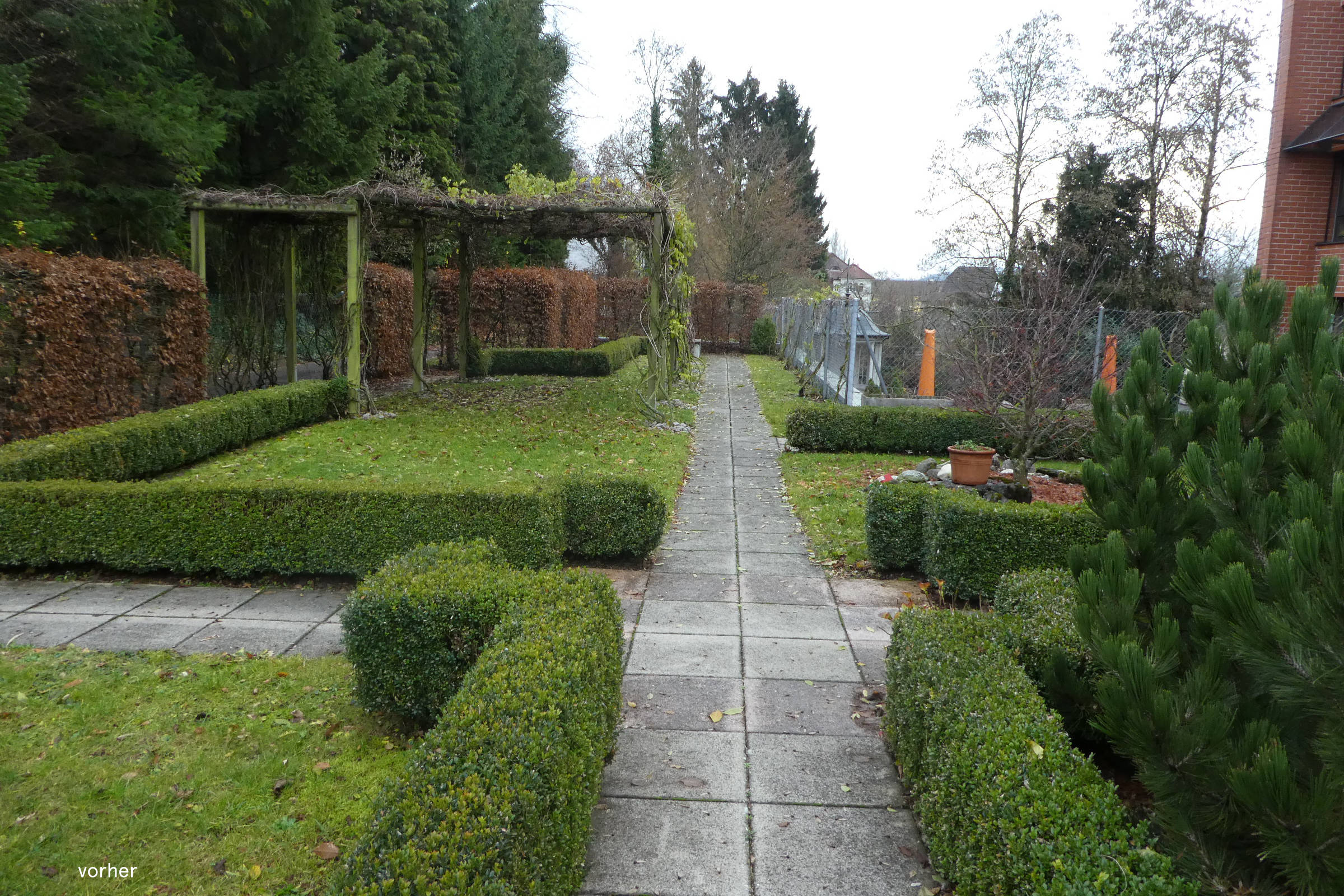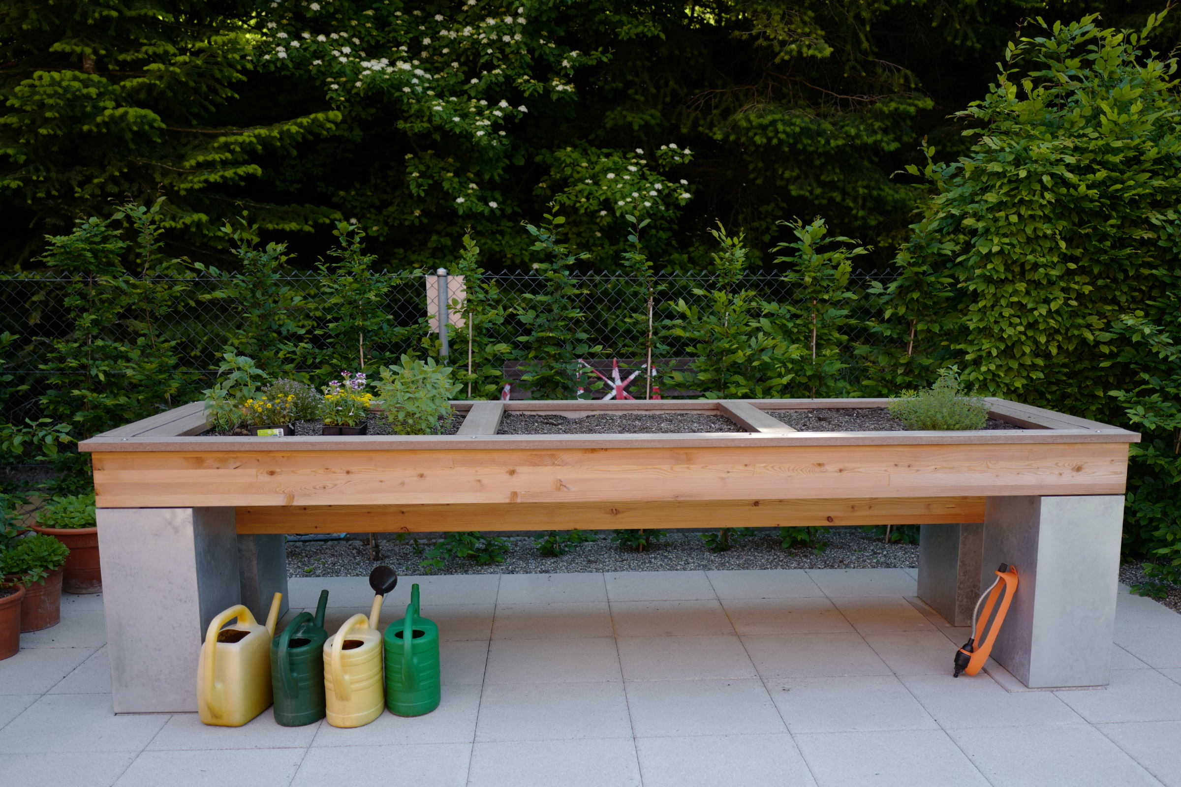 Der überarbeitete Garten bietet viel Platz für Bewegung, er ist gefasst mit Stauden- und Sträucherpflanzungen und die grosszügige, mit Kletterpflanzen bewachsene und teilweise überdachte Pergola wird bald ausreichend Schatten bieten, um darunter gemütlich einen Café mit Kuchen zu geniessen.