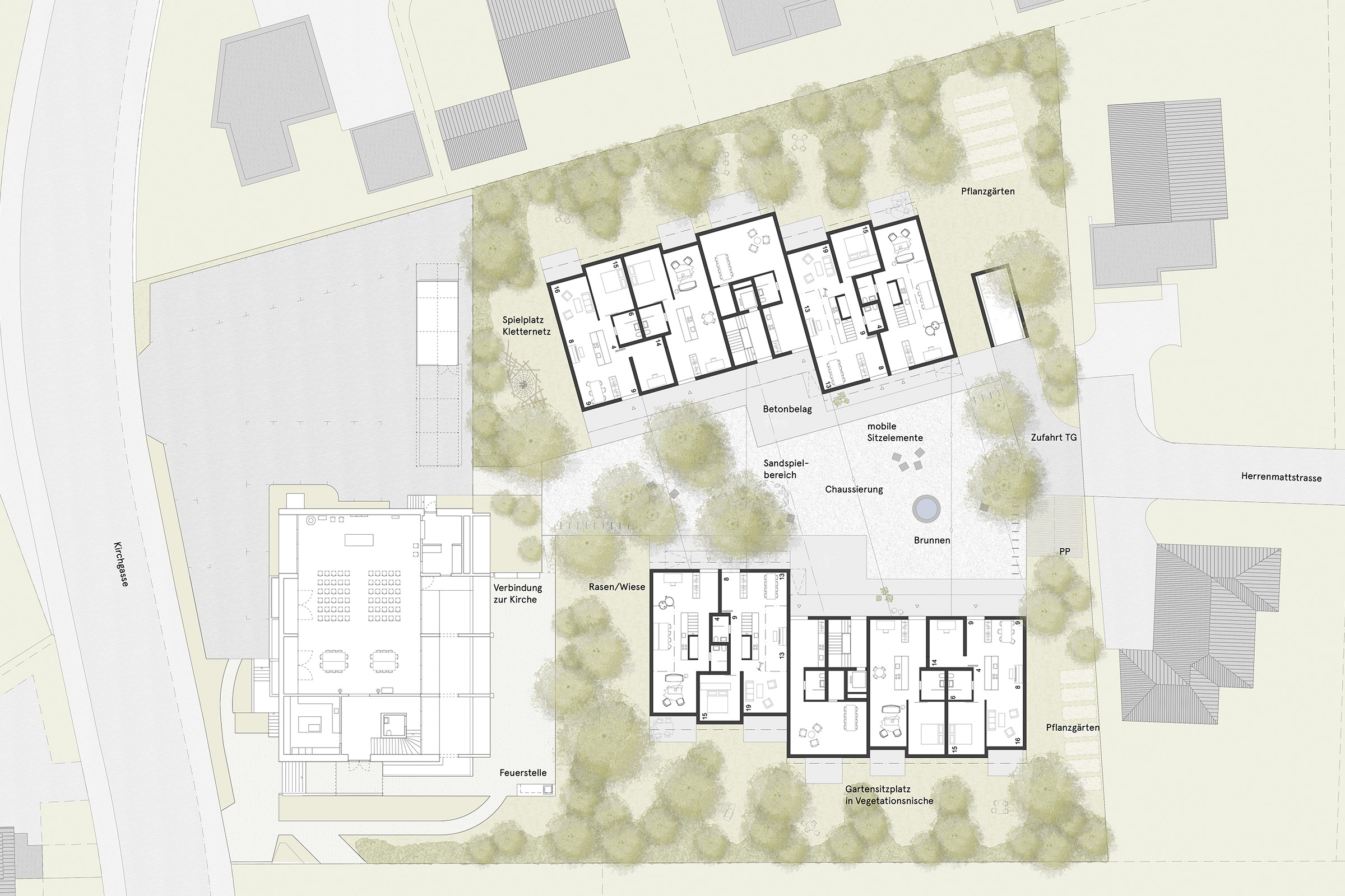 Die zwei Zeilenbauten schaffen, durch ihre abgestufte Geschossigkeit, den Brückenschlag von den grossmassstäblichen Bauten entlang der Kirchgasse zum Einfamilienhausquartier. Die grosszügigen Gebäudeabstände vielfältige Aussenräume, welche auf die unterschiedlichen Nutzungen eingehen.