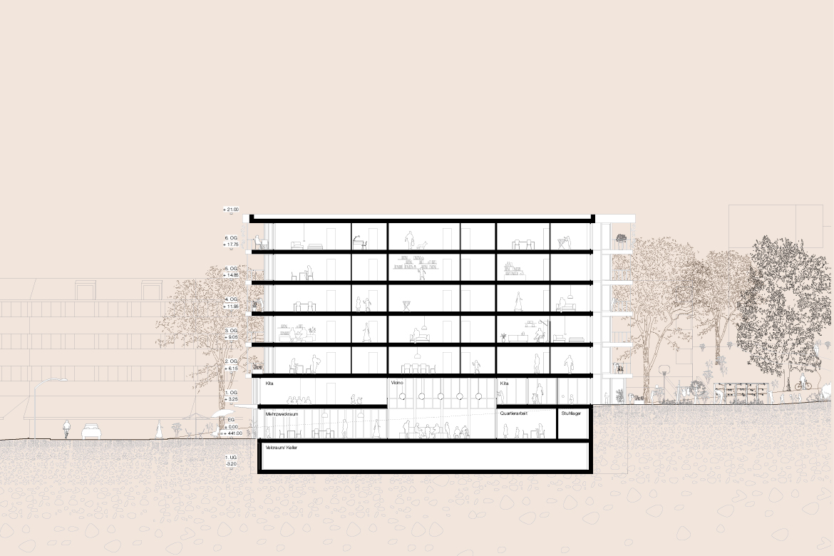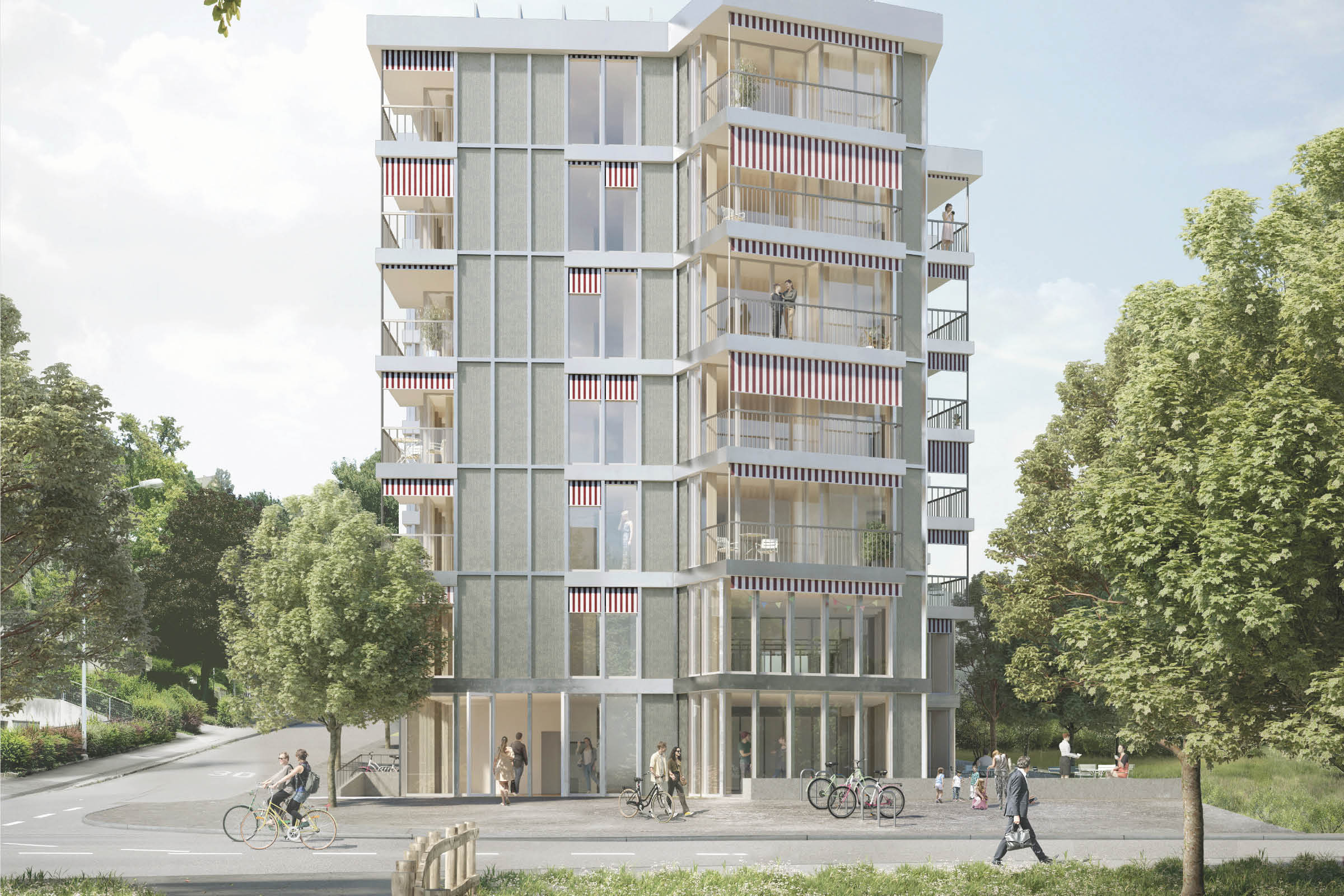 Vorgesehen ist ein siebenstöckiges, turmartiges Quartierhaus an der Kreuzung Würzenbachstrasse und Würzenbachmatte. Durch die mehrfach abgewinkelte, mit Vor- und Rücksprüngen sowie Fotovoltaikpaneelen versehene Fassade wirkt der nachhaltige Holz/Beton-Hybridbau trotz seiner Grösse nicht massig. In den unteren beiden Etagen ist Platz reserviert für die Quartierarbeit, die Nachbarschaftshilfe Vicino, eine Kindertagesstätte, Räume für die reformierte und katholische Kirchgemeinde sowie einen zweistöckigen Mehrzwecksaal.