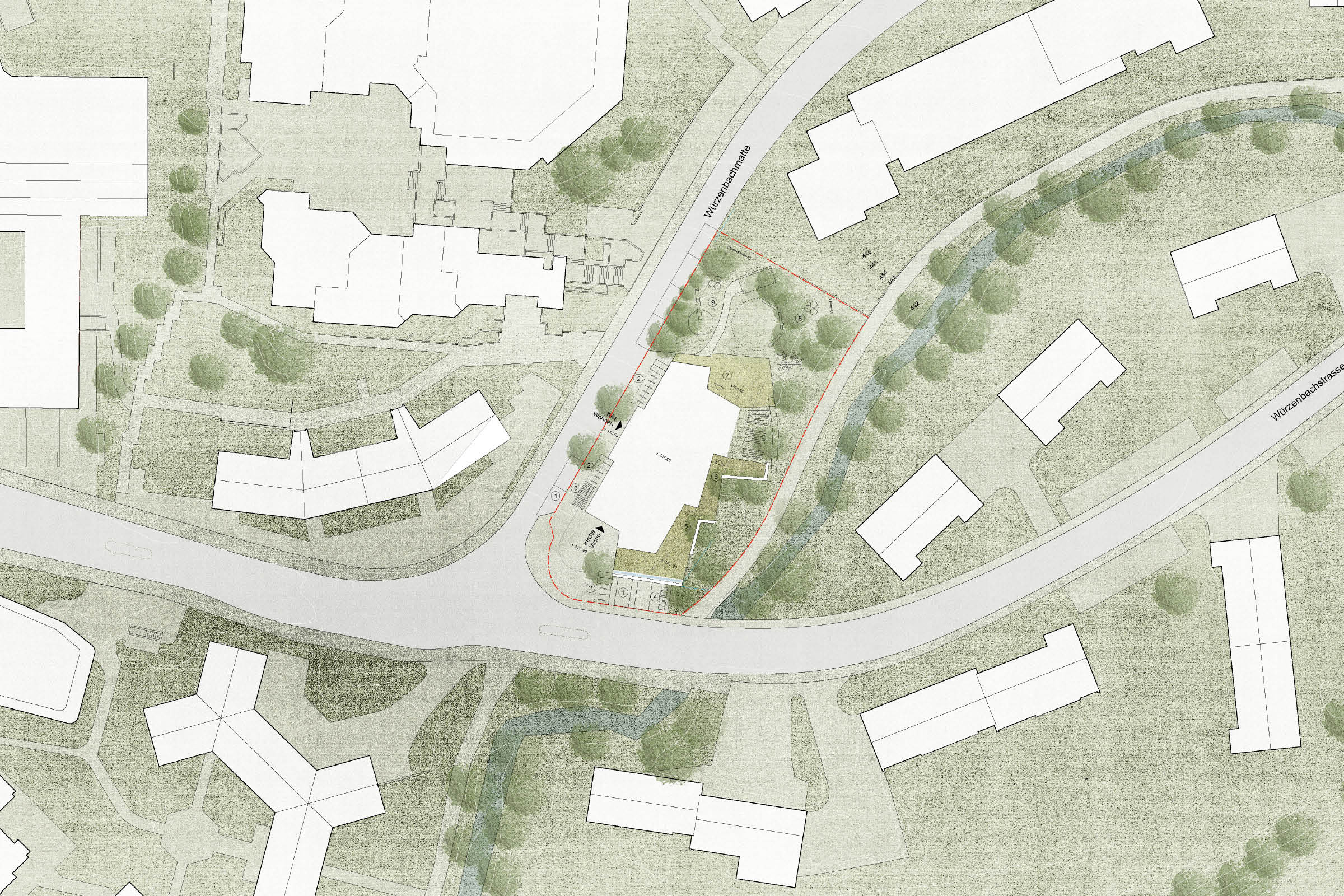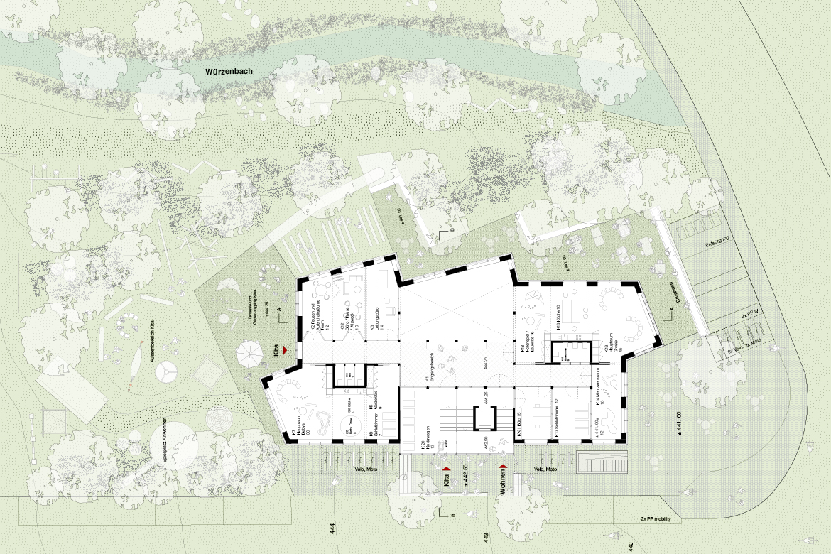 Die Wohnungen und die Kita erreicht man von der Würzenbachmatte her. Für die Kindertagesstätte steht ein grosser Garten mit viel schattenspendenden Bäumen, Sitz- und Spielmöglichkeiten zur Verfügung. Die Topografie und der üppige Baumbestand bieten ideale Gegebenheiten.