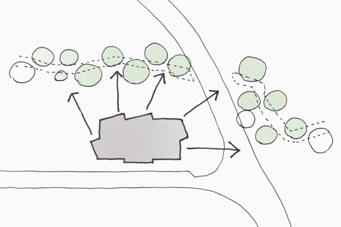 Bäume bieten im Sommer Schatten und kühle Orte an. Sie greifen die bestehende Vegetation des Würzenbachs auf. Sensible Stellen werden mit Wildhecken vor fremden Blicken abgeschirmt.