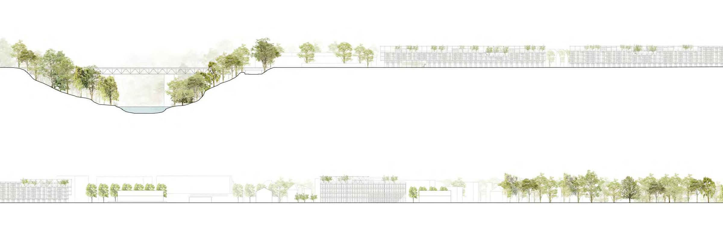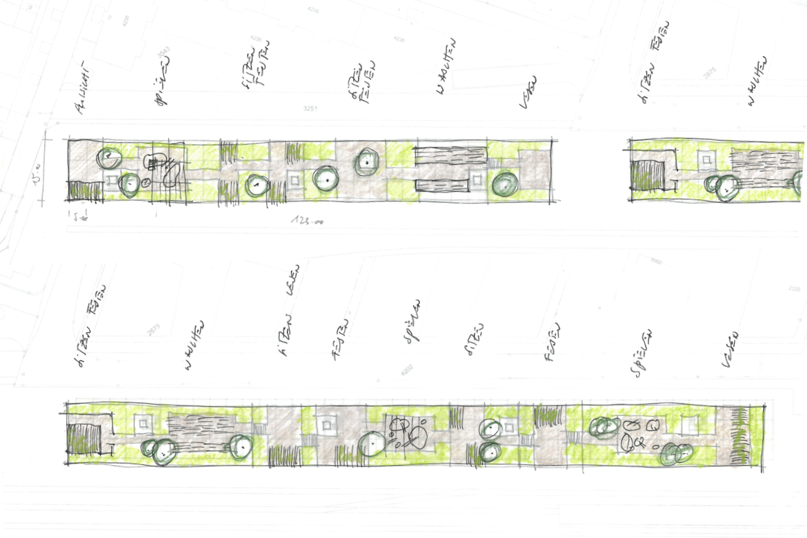 Die schattige Nordostseite ist als einladende Adresse und Ort für Alltagsbegegnungen konzipiert. Verschiedene Baumgruppen und -reihen in Kombination mit differenzierten Vegetationsflächen prägen den Freiraum, verbessern das Mikroklima und bieten Tieren Lebensraum. Möglichst viele Hartflächen werden entsiegelt.