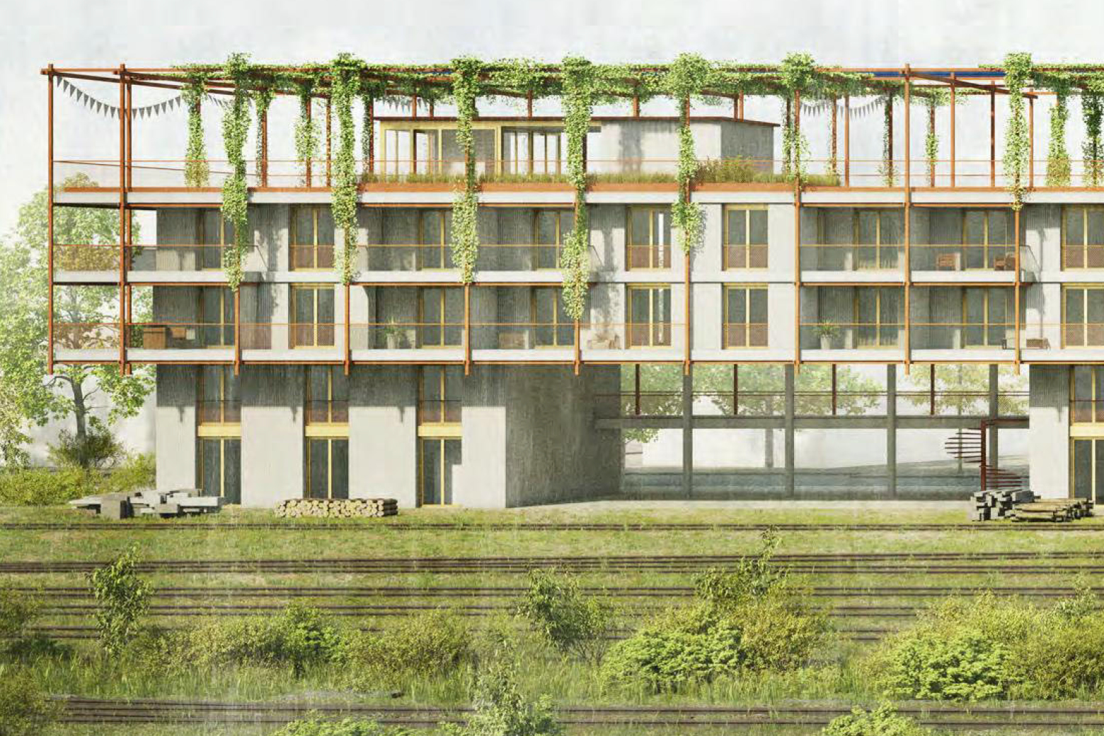 Die neuen Wohn- und Gewerbebauten gliedern sich an die Bahnlinie an. Adressbildende Merkmale der neuen Bauten sind die Dachgärten, die tiefen Fassadenschichten mit Laubengängen und Balkonen bei den beiden Wohnbauten. Weil Freiraum in dieser baulichen Dichte Mangelware ist, wandert der Aussenraum für die Anwohner auf die Dächer. Sie werden als zusammenhängende, gemeinschaftliche Dachgärten ausgebildet und bieten Aufenthaltsorte, Spielflächen, grosszügige Grünflächen mit Stauden und Kleingehölzen.