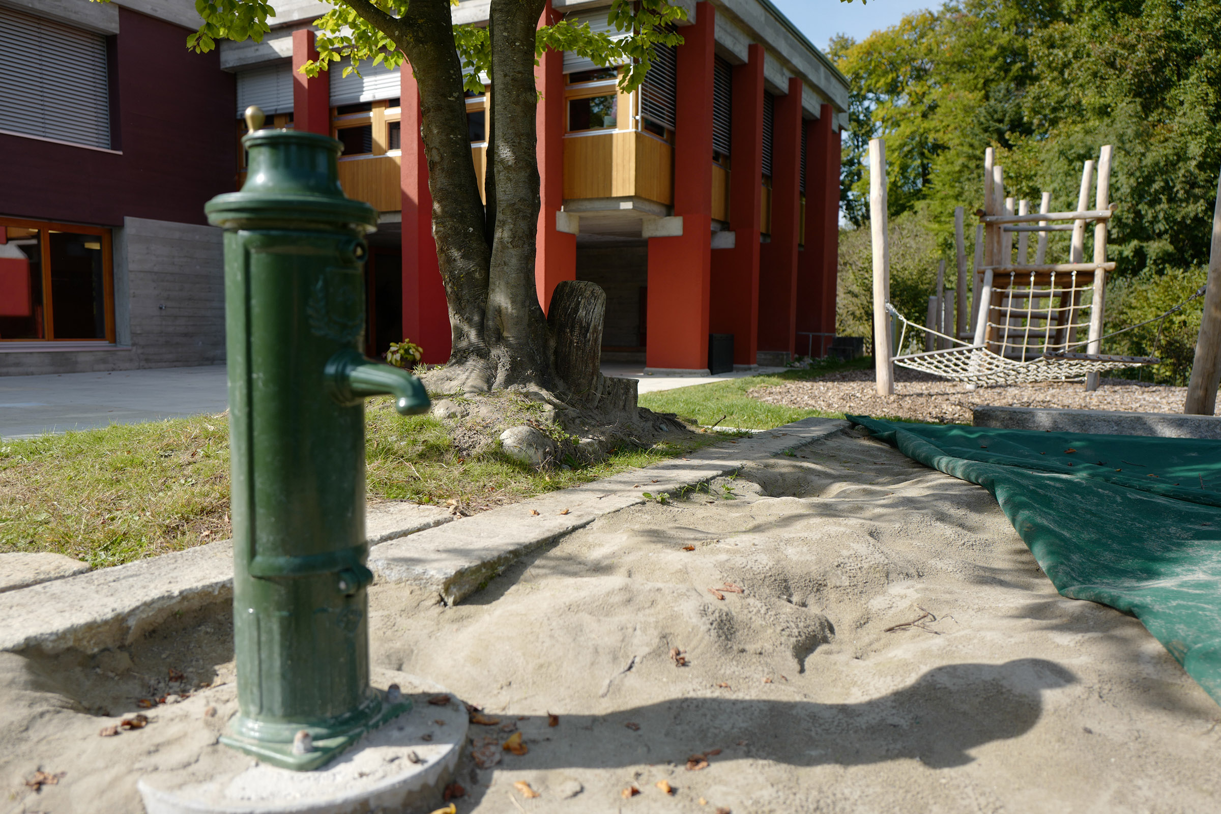 Dem Erweiterungsbau musste ein Teil des Gartens weichen. Die stimmige Anlage aus dem Jahr 1966 war geprägt von der Topographie, die von Gneisstufen gehalten war, sowie von unterschiedlichen Belagsarten und –formaten. Die Neugestaltung suche eine Kontinuität in der Formensprachen und der Materialität. Aus den Gneisstufen entstand ein grosszügiger Sandkasten mit Sitzbalken, die übergehen in die Sitzarena. Die bestehenden, grossformatigen Betonplatten wurden wieder verlegt in einem Verbund mit neuen Platten unterschiedlichen Formaten. Der Vorplatz geht nahtlos in den Zugangsweg über. Die Robinienstämme des Spielplatz nehmen Bezug zum angrenzenden Wald, eine Wildhecke fasst das Grundstück zum Wald hin ein und gibt dem Garten Halt.