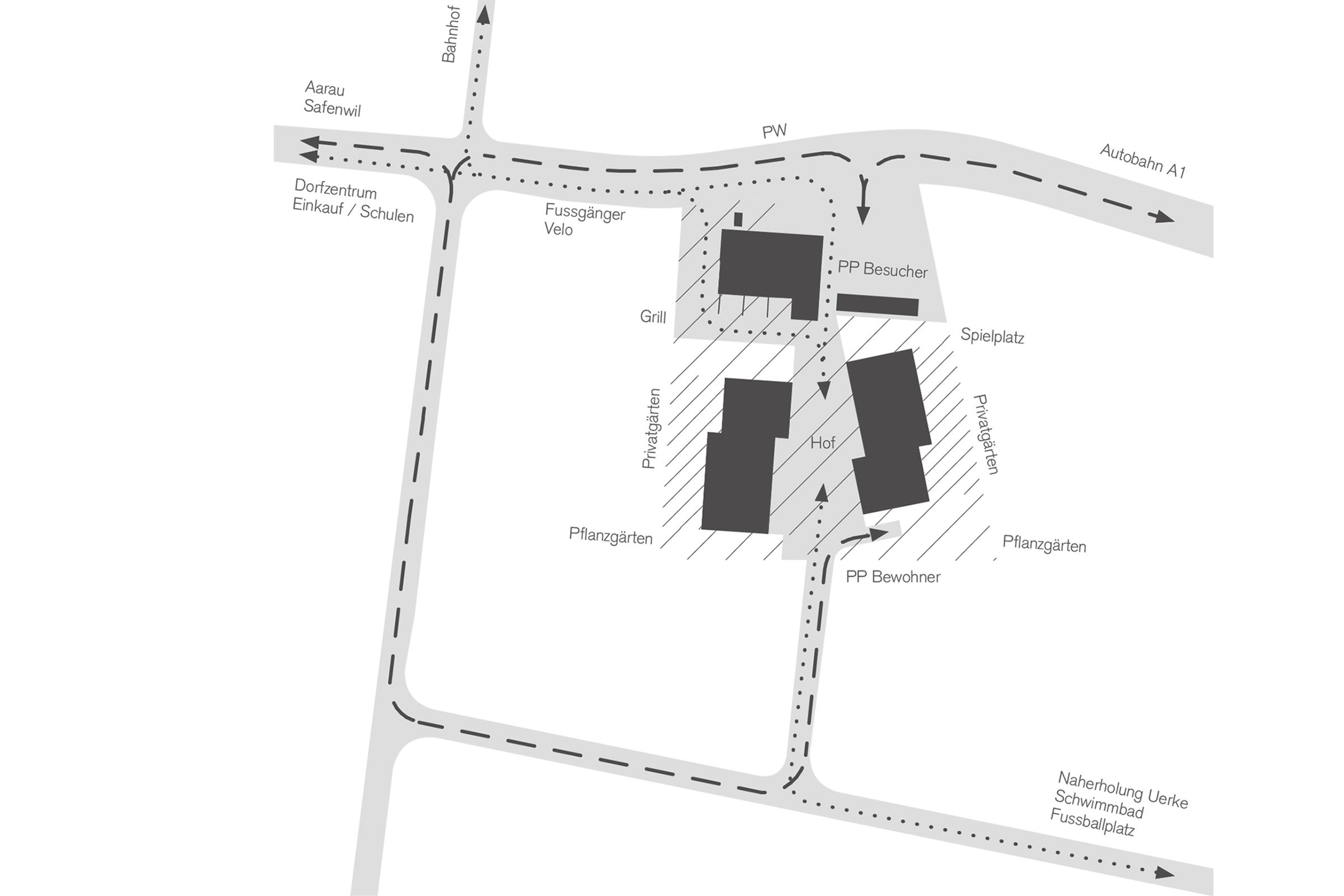 Auf der Aussenseite umgibt eine grüne Hülle die Wohnüberbauung. Diese schafft Distanz und Sichtschutz. Grüne Nischen in der Hecke auf der Innenseite können von den Bewohner der Erdgeschosswohnung als Gartenzimmer genutzt werden. Die Pflanzgärten im Süden werden gemeinschaftlich genutzt und im Norden steht ein Kletterspielplatz für die grösseren Kinder.