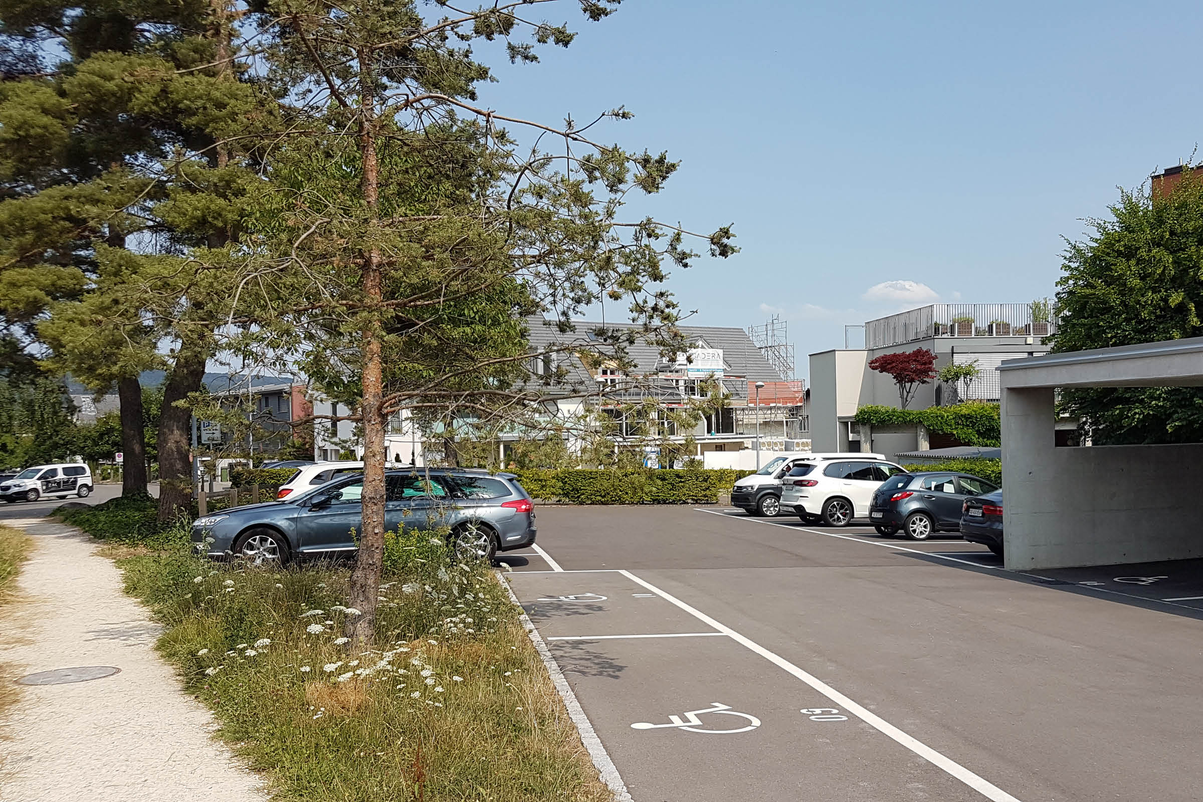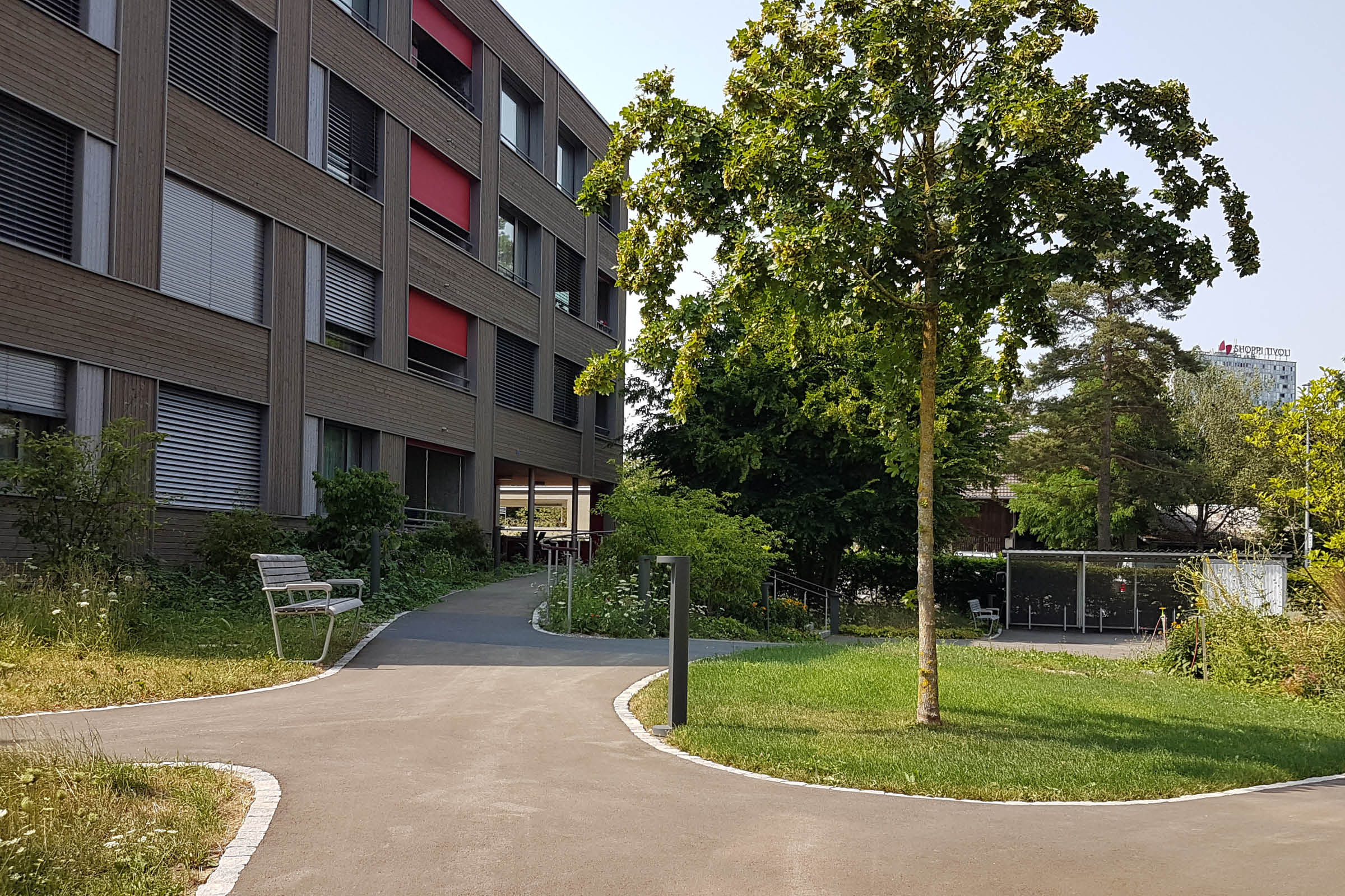 Die bunten, in Gebäudenähe angelegten Staudenflächen ergeben einen sich jahreszeitlich verändernden Blütenregen, der auch aus den Innenräumen gut zu beobachten ist. Im Schatten von Bäumen und der begrünten Pergola sind gemütliche Sitzbereiche entstanden mit Aussicht Richtung Dorfzentrum und bewaldetem Hang vom Heitersberg.