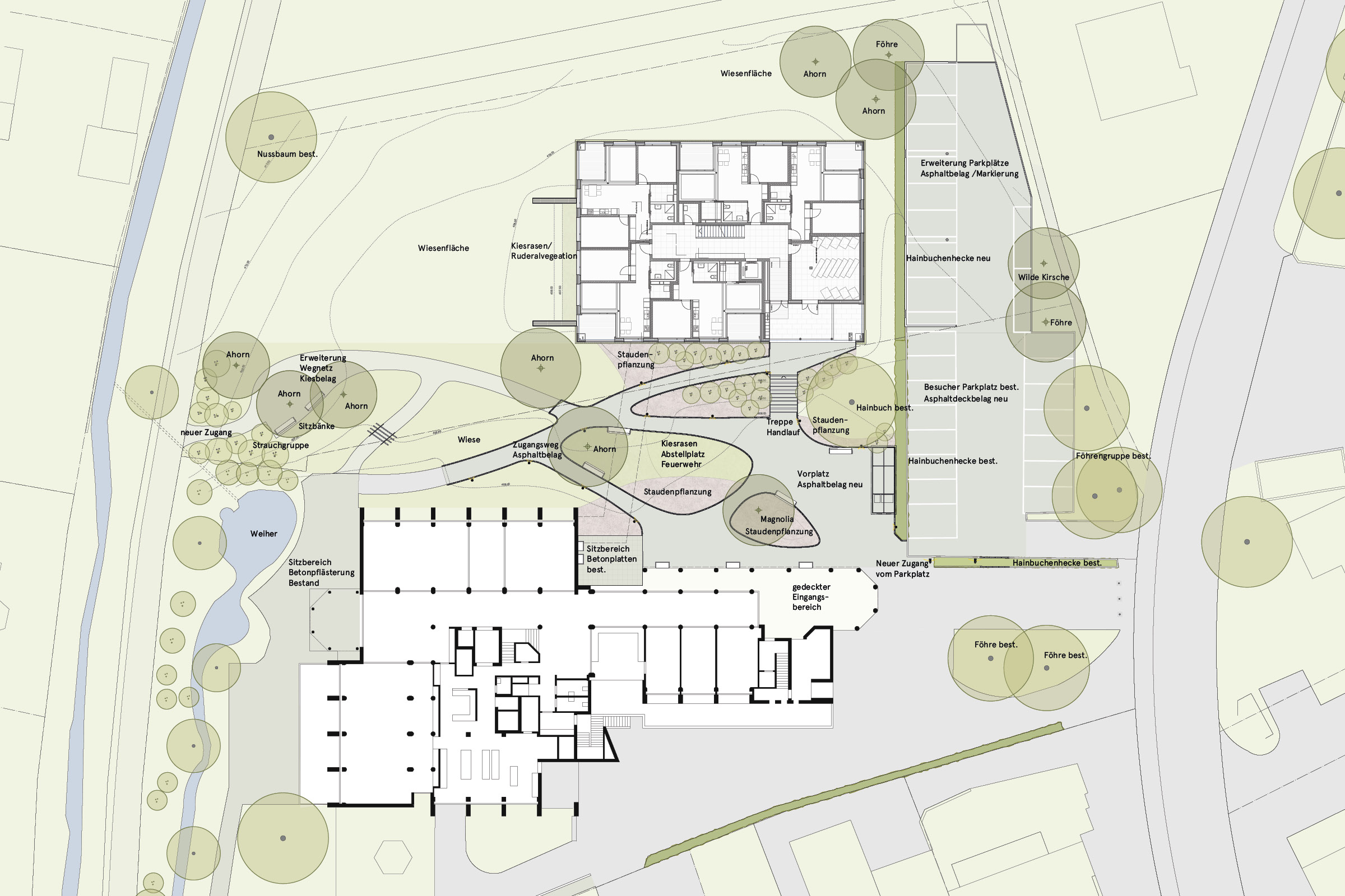 Durch die städtebauliche Setzung des Erweiterungsbaus entsteht zwischen den Bauten ein vielfältiger Freiraum für Bewegung und Begegnung. Das dicht angelegte, geschwungene Wegnetz bietet mit verschiedenen Weggefällen, Treppen und unterschiedlichen Belagsoberflächen ein abwechslungsreiches Angebot.