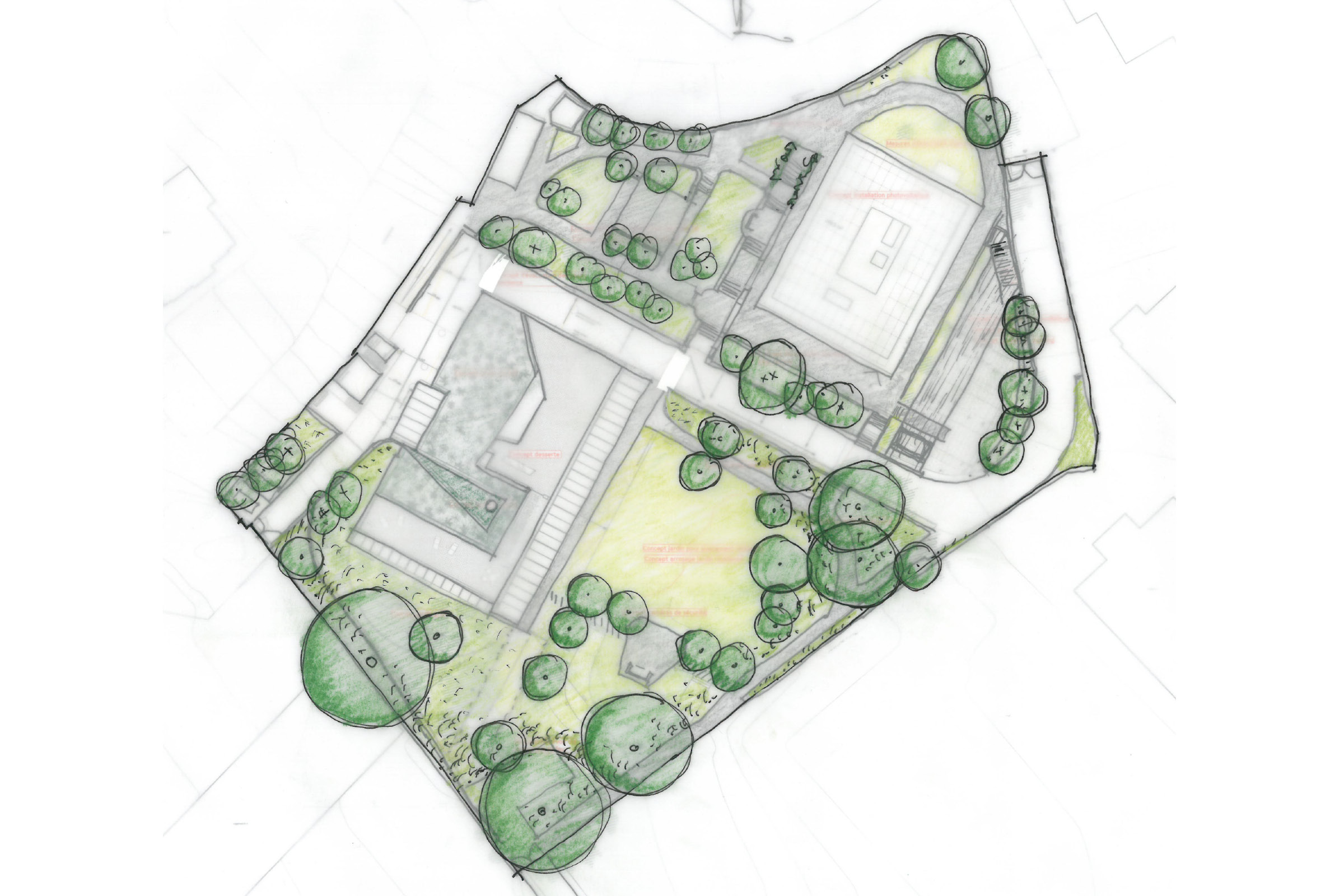 In einem alten Villengarten mit ursprünglichem Baumbestand wurde vor circa 10 Jahren die Kanzlei an der Stelle des ehemaligen Tennisplatzes gebaut. Durch den Neubau der Residenz konnte der Garten reorganisiert werden.