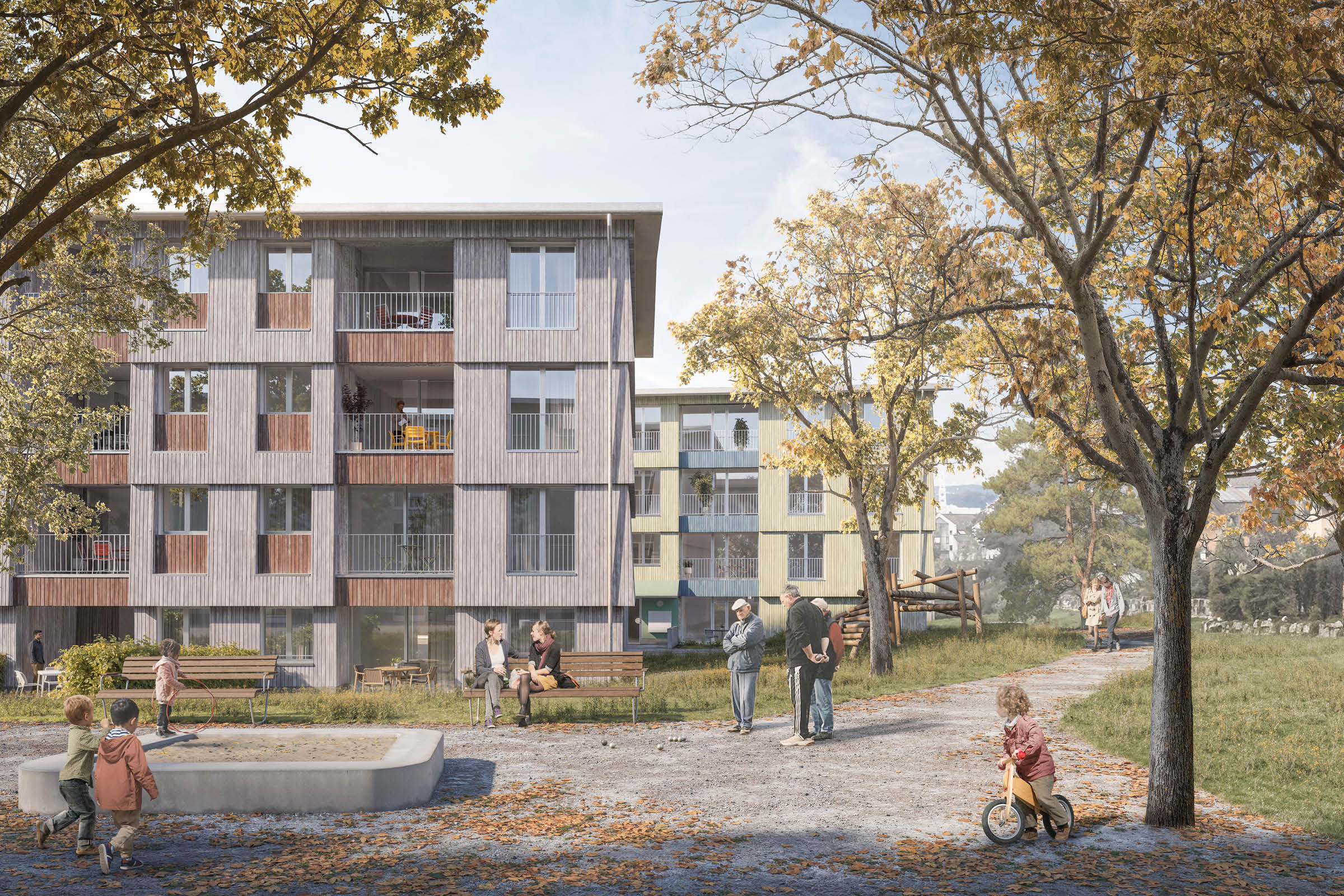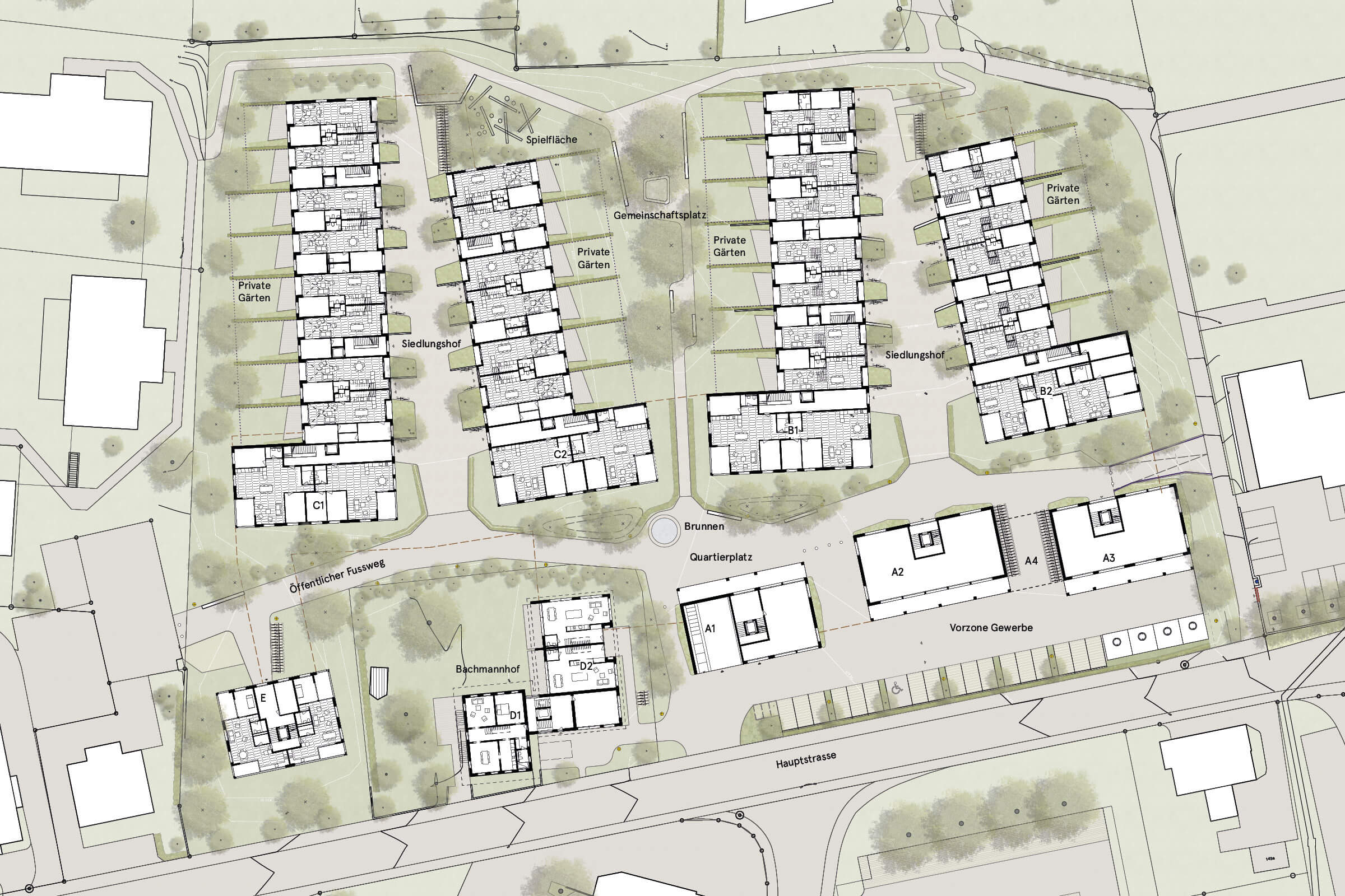 Prägend für den Platz und die Wohnumgebung ist auch der alte Bachmannhof mit seinem Obst- und Bauerngarten. Mit dem Bauernhofgebäude bleibt auch die wertvolle Mauerseglerkolonie an ihrem Standort erhalten. Der Altbau mit dem neuen Anbau und der beides umfassende Garten halten die Qualität und Ausstrahlung dieses historischen Elements lebendig. Das Gebäude E ist dank seiner Dimensionierung und der Platzierung inmitten eines üppigen Gartens eine stimmige Ergänzung zum Bachmannhof und den Gebäuden am Platz. Es vervollständigt die grüne Fassung des neuen Fussweges.