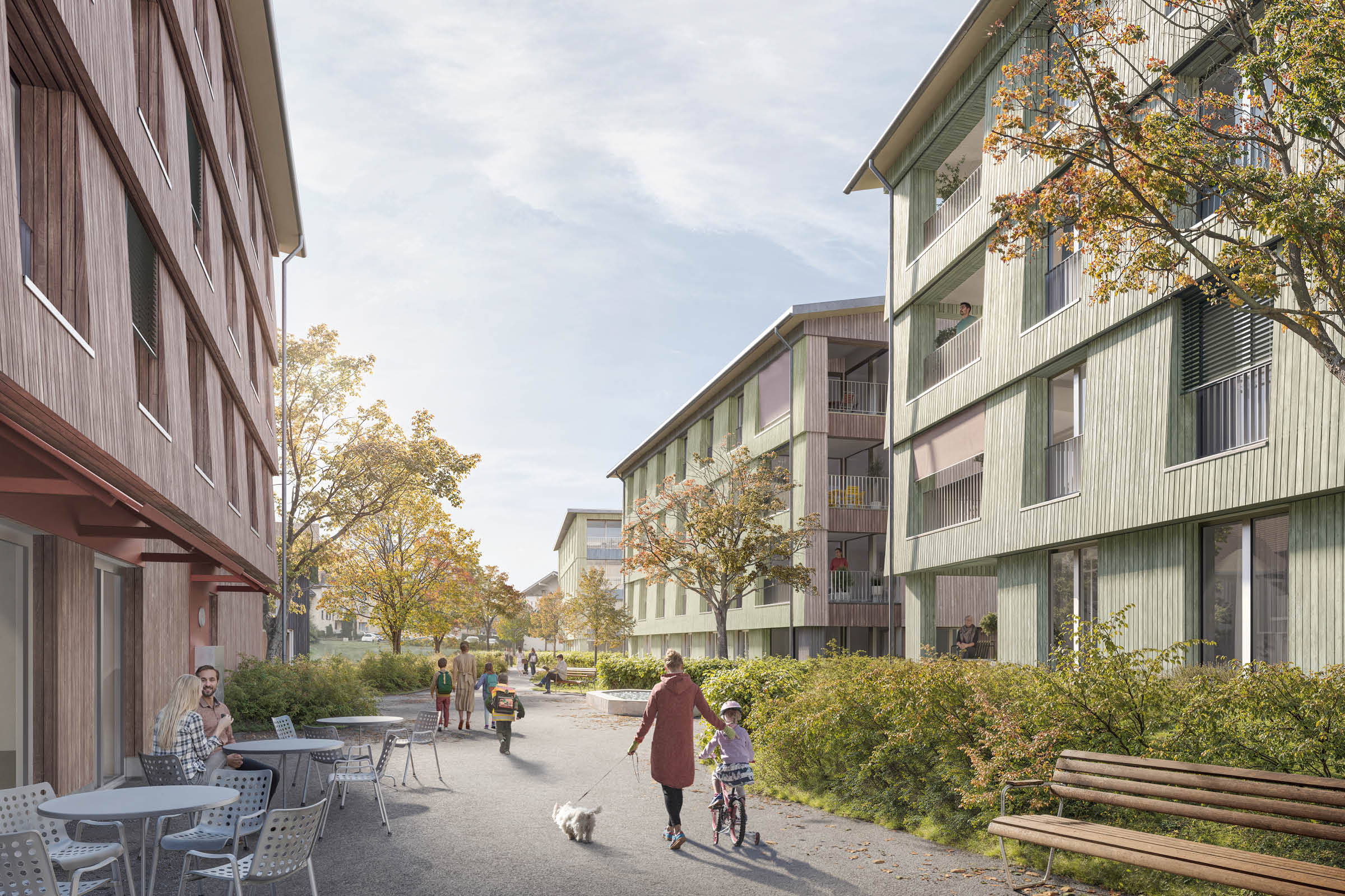 Entlang des Platzes – zwischen den rückwärtigen Wohngebäuden und den Punktbauten an der Strasse – verläuft auch die neue Fussgängerverbindung. Sie führt von der Schule bis in den alten Dorfkern. Die Schüler erhalten so eine sichere Alternative zu ihrem bisherigen Schulweg, der Langsamverkehr belebt den Platz und damit das Gewerbe in den Neubauten. An der Schnittstelle zwischen Weg, Platz und den Wohnriegeln, zwischen privatem und öffentlichem Leben, liegt der Quartiersplatz, welcher mit einem grossen Trinkbrunnen ausgestattet ist.
