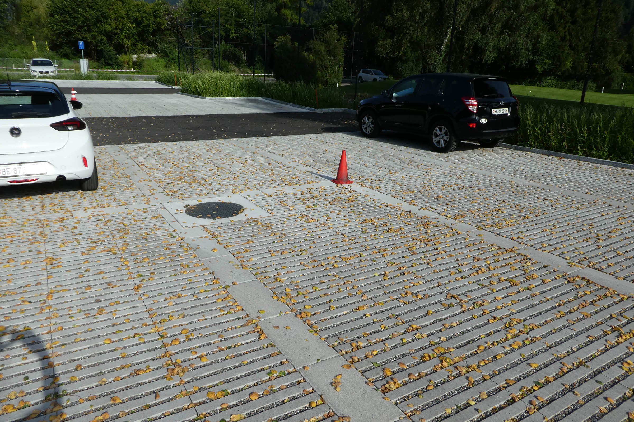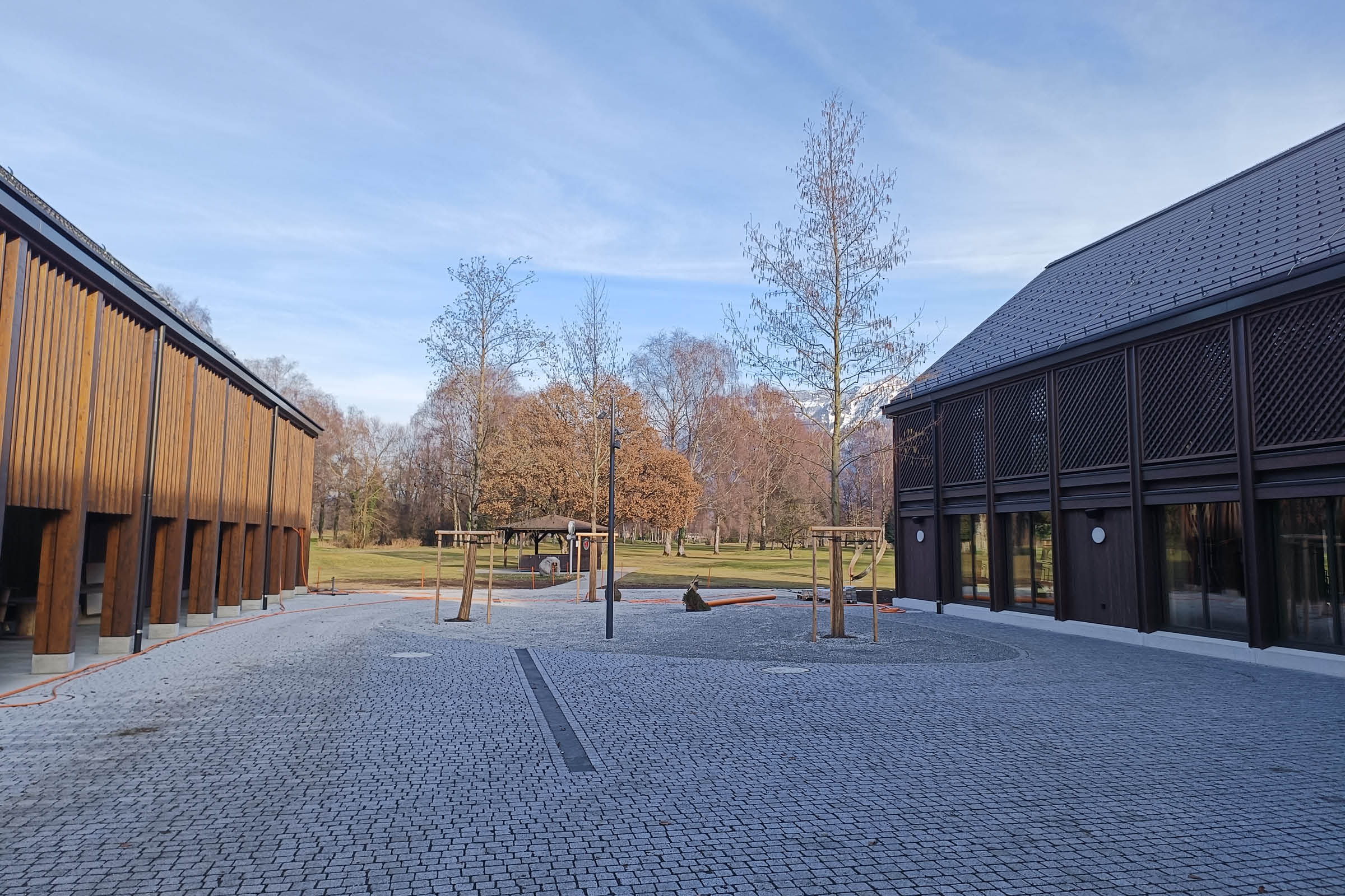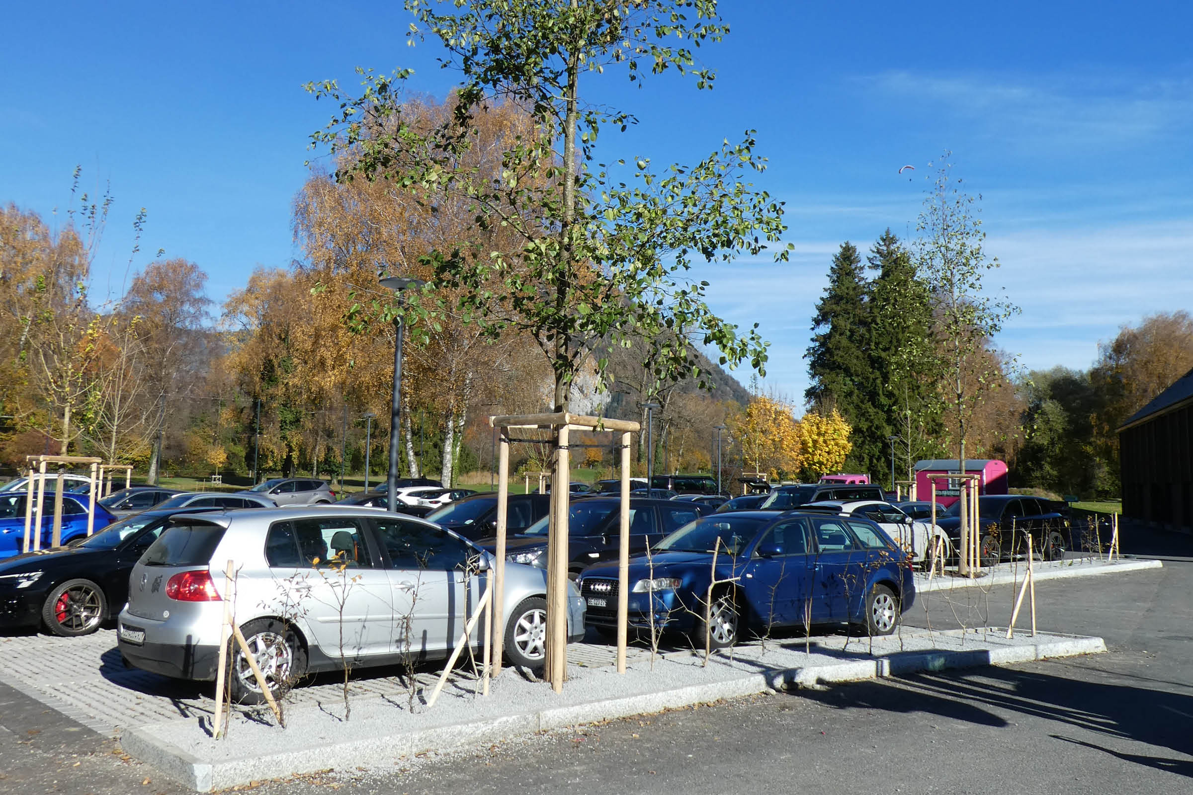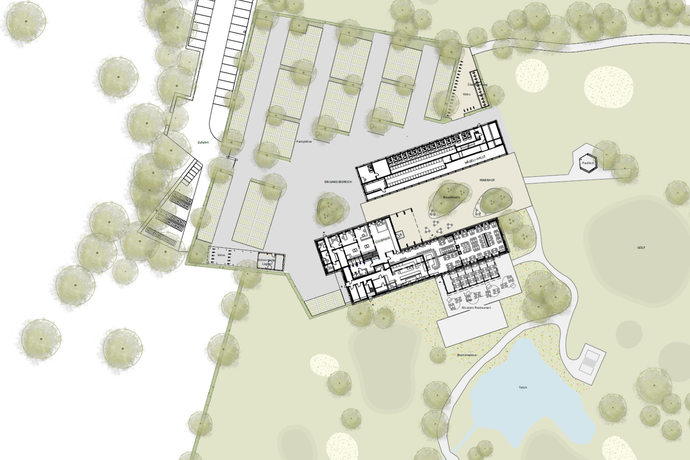 Die Baumsetzung im Hof und auf dem Parkplatz nimmt direkten Bezug auf die parkartige Golfanlage und ist Bindeglied zwischen den verschiedenen Orten. Auf dem Parkplatz ist sie zusätzlich als Schattendach von zentraler Bedeutung.