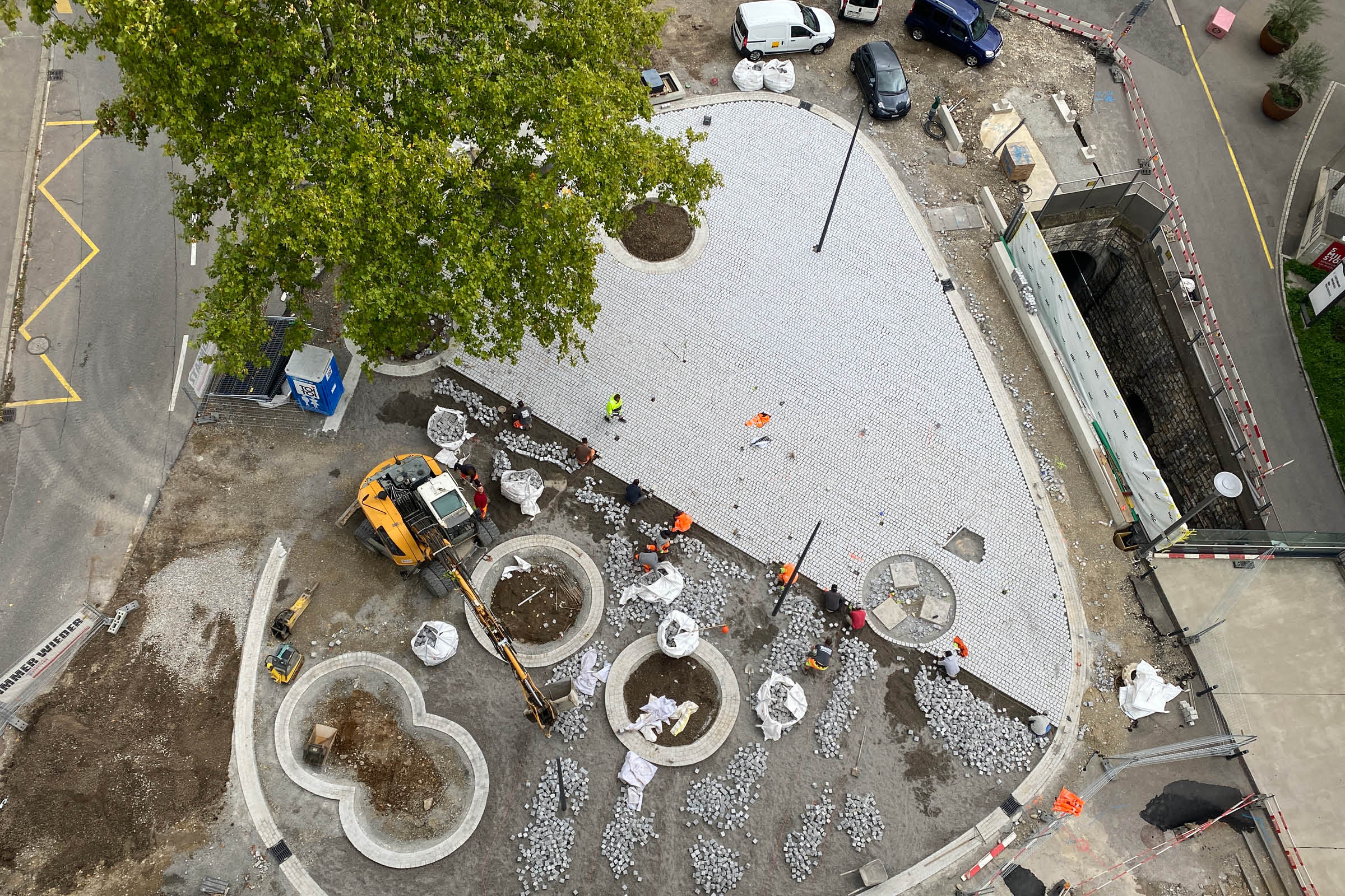 Eine gross gewachsene Platane wurde in die Neugestaltung integriert und erzählt von der Geschichte des Ortes. Sie wird ergänzt durch eine scheinbar zufällige Setzung von Baumpaaren, die Rundbänke um die Bäume ermöglichen ein Verweilen in deren Schatten. Das grosszügige Wasserbecken aus Naturstein spendet kühles Wasser und der breite Rand lädt zum Sitzen ein. Hohe Lichtmasten mit Strahlern schaffen stimmungsvolle Lichtflächen auf dem Belag und ermöglichen eine sichere Durchwegung.