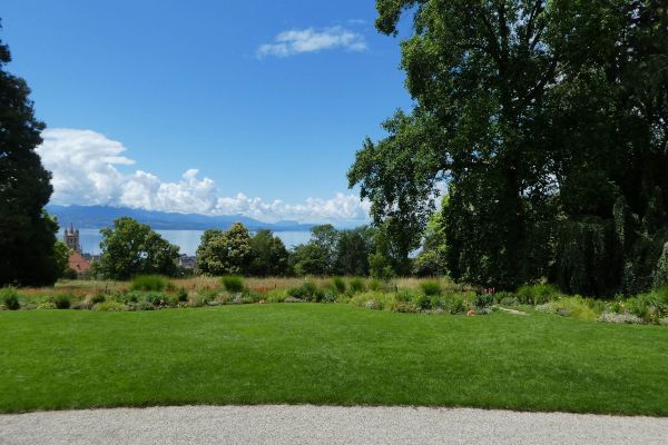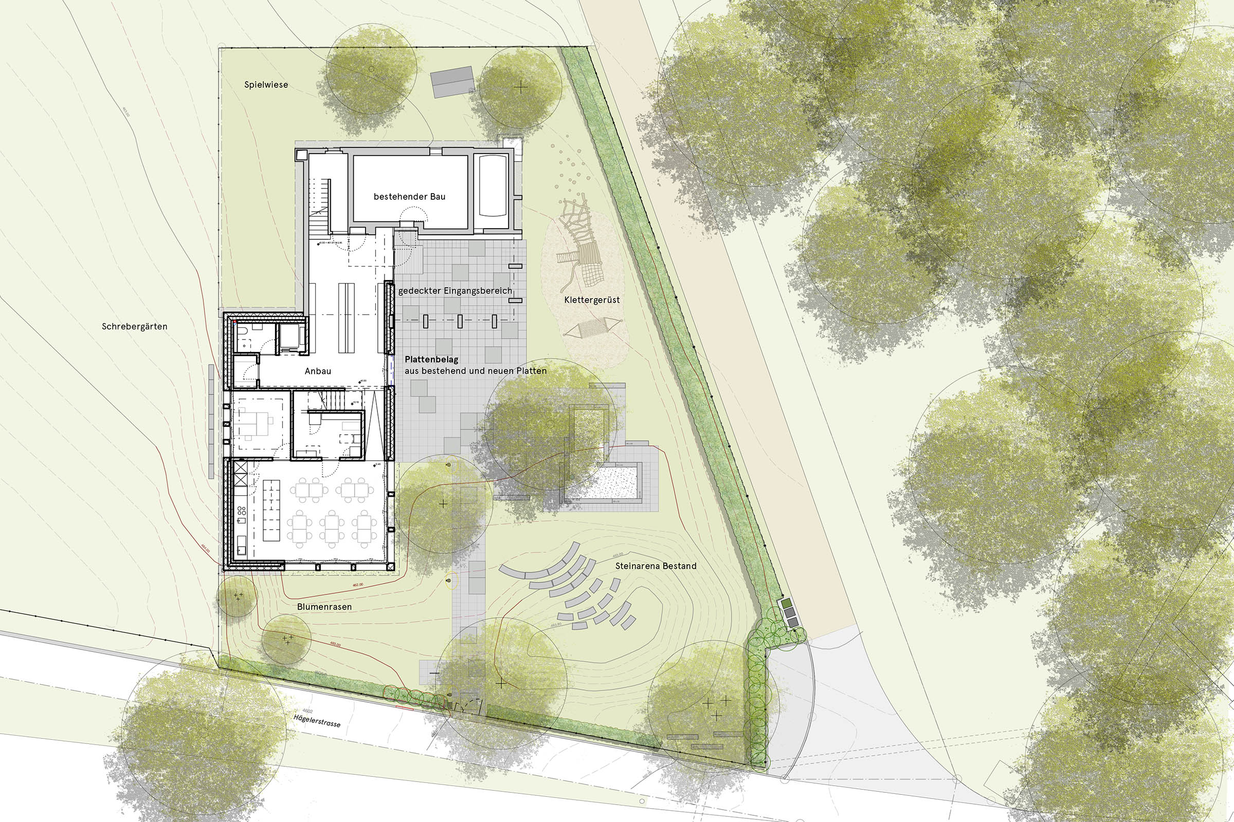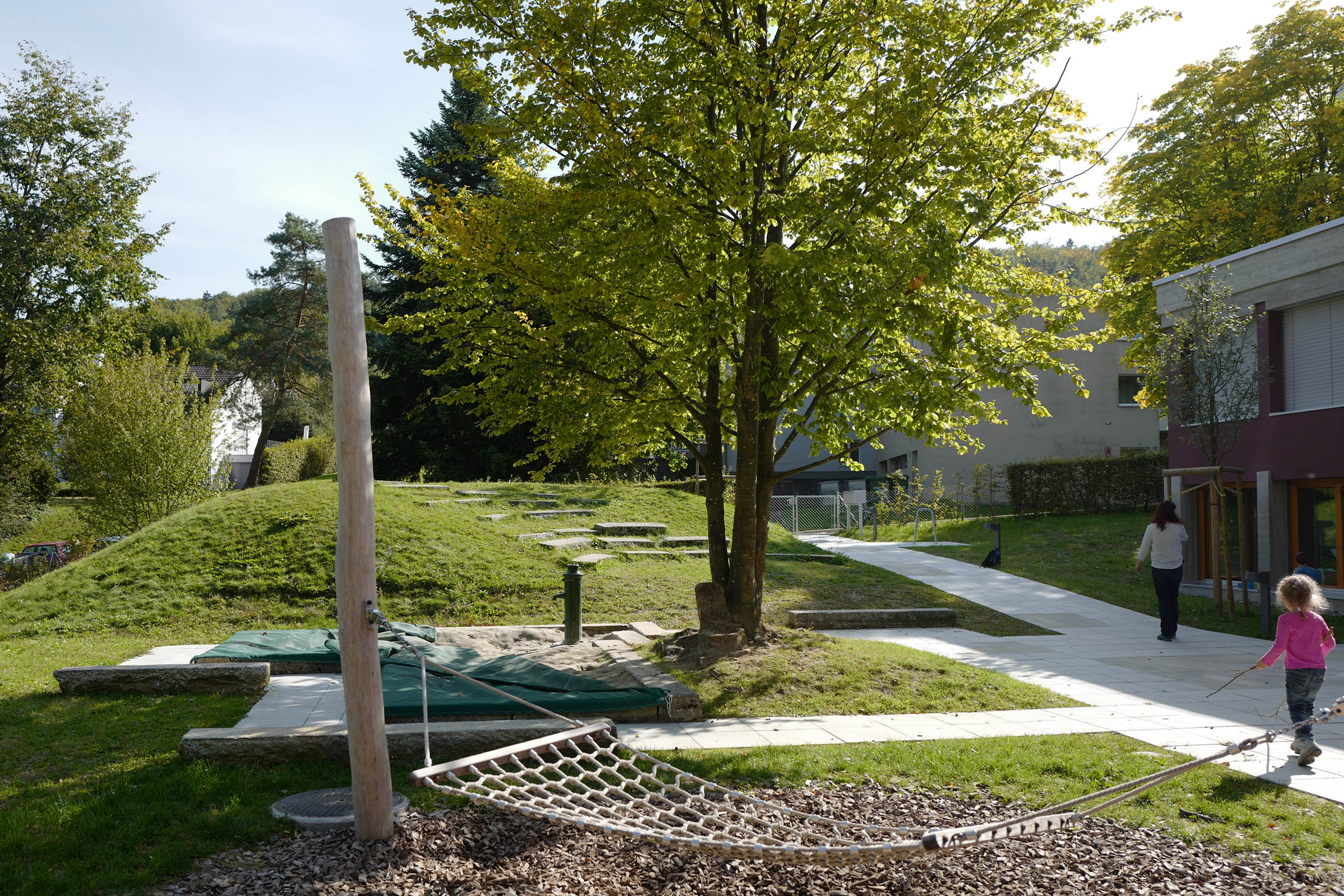 Dem Erweiterungsbau musste ein Teil des Gartens weichen. Die stimmige Anlage aus dem Jahr 1966 war geprägt von der Topographie, die von Gneisstufen gehalten war, sowie von unterschiedlichen Belagsarten und –formaten. Die Neugestaltung suche eine Kontinuität in der Formensprachen und der Materialität. Aus den Gneisstufen entstand ein grosszügiger Sandkasten mit Sitzbalken, die übergehen in die Sitzarena. Die bestehenden, grossformatigen Betonplatten wurden wieder verlegt in einem Verbund mit neuen Platten unterschiedlichen Formaten. Der Vorplatz geht nahtlos in den Zugangsweg über. Die Robinienstämme des Spielplatz nehmen Bezug zum angrenzenden Wald, eine Wildhecke fasst das Grundstück zum Wald hin ein und gibt dem Garten Halt.