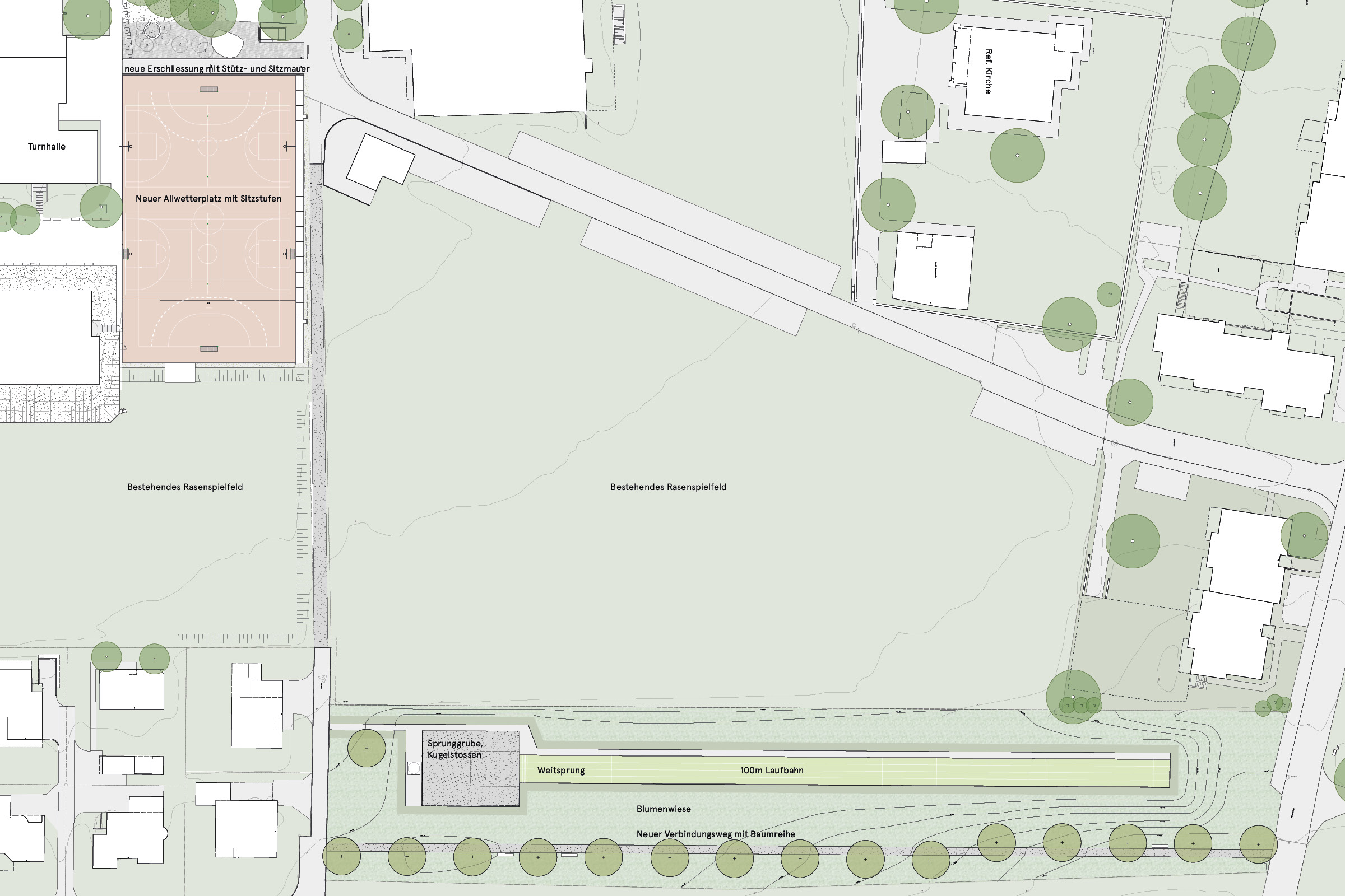 Der bestehende Allwetterplatz, zugleich Sportplatz für die Schule und Pausenplatz, war zu klein geworden und in die Jahre gekommen. Mit der Vergrösserung konnten entlang des neuen Platzes Sitzstufen wie auch eine neue Fussverbindung zwischen der Schule und der höher gelegenen Sporthalle realisiert werden.