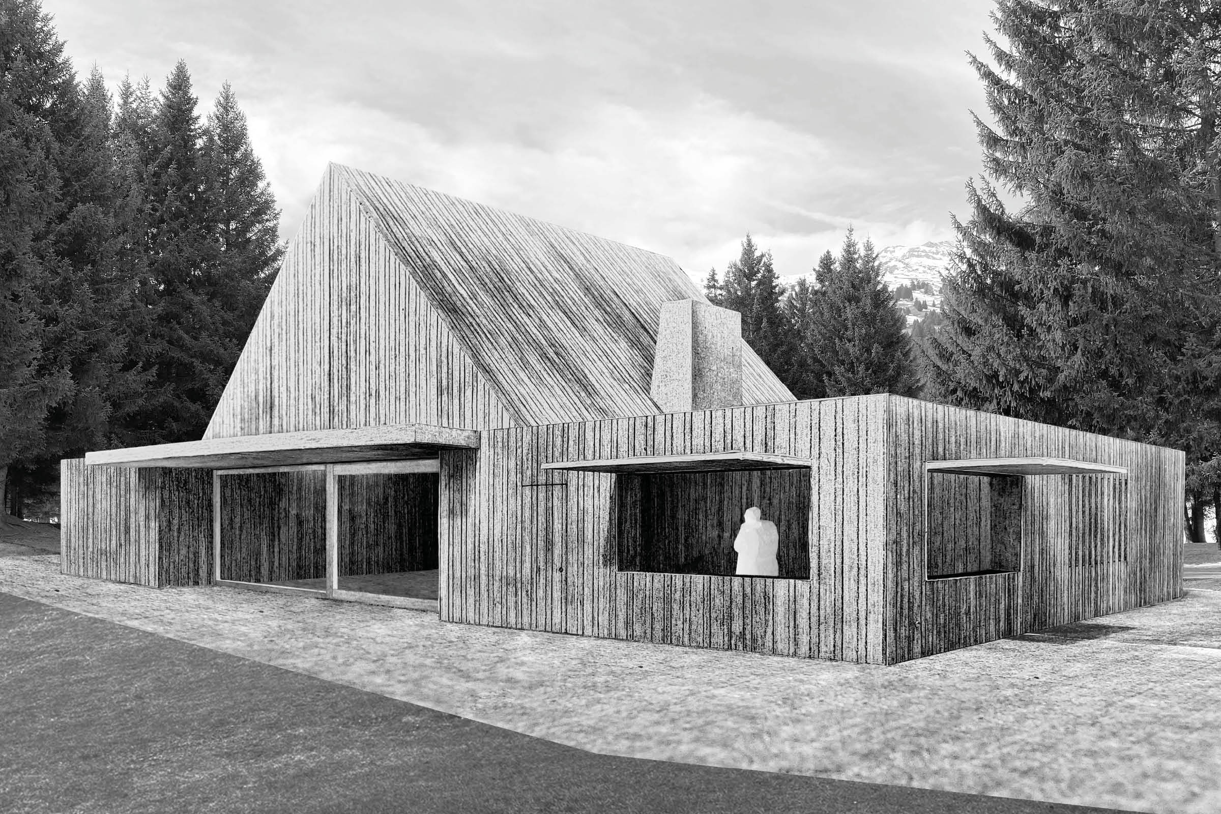 Das Umfeld des Lido ist eine Postkartenlandschaft im besten Sinne. Wenige starke Elemente – ein herrliches Bergpanorama, ein malerischer See, Wiesen, Baumgruppen und Wald – machen den Ort aus. In diesem Sinne der Reduktion auf das Wesentliche setzt der Entwurf die Idee der Postkartenlandschaft um. Der Neubau und die Freiraumgestaltung stellen die Landschaft ins Zentrum und vereinfachen sie wieder auf ihre zentralen Qualitäten. Das drückt sich vor allem in zwei grundlegenden Entscheidungen aus: In der Platzierung des Restaurants auf dem erhöhten Sattel. Und in einer Freiraumgestaltung, die auf Weite und visuelle Ruhe setzt und all ihre Elemente aus der Landschaft heraus entwickelt.