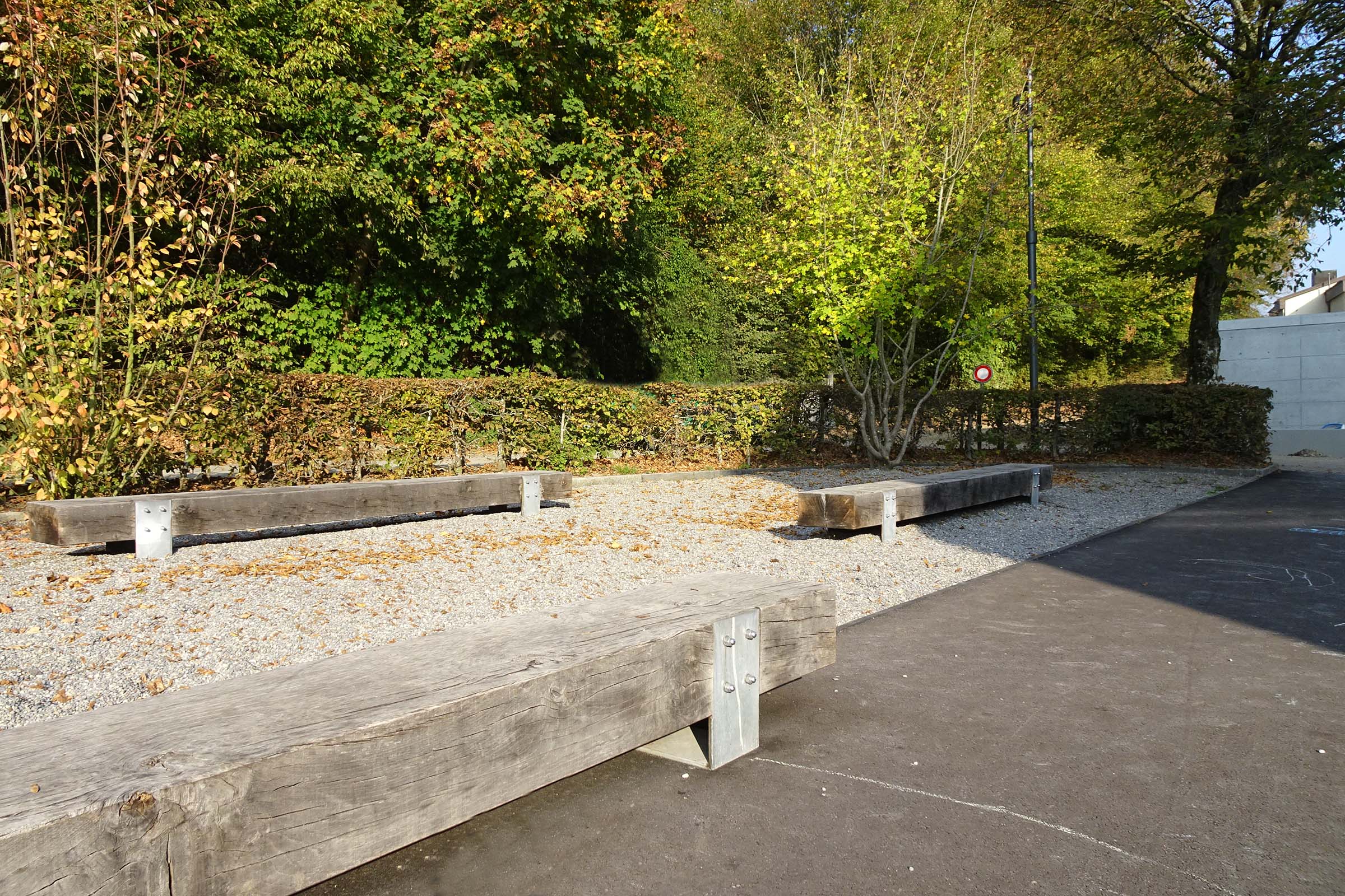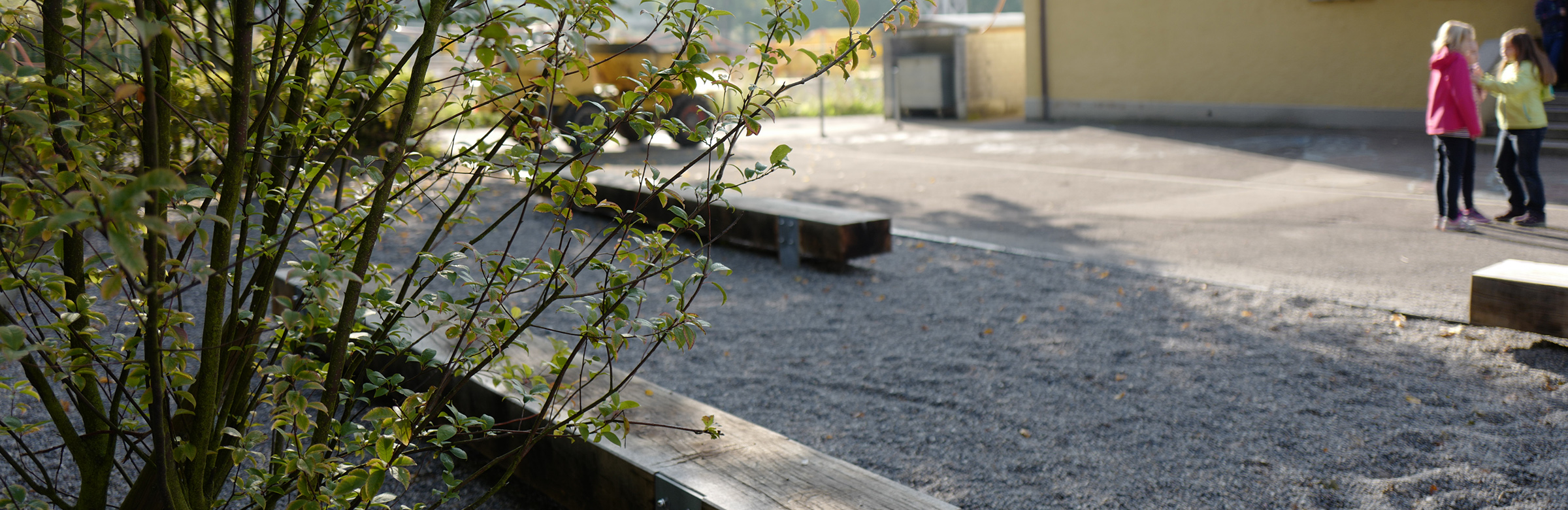 Ein grosszügiger Eingangsbereich wurde geschaffen, der auf den eigentlichen Pausenplatz zwischen den Gebäuden führt. Die neue Treppenanlage aus Ortbeton verbindet die bestehenden mit den neuen Schulbauten. Auf dem Pausenplatz können sich die Schüler unter Bäumen auf langen, massiven Eichensitzbalken niederlassen. Der Asphaltbelag läuft an den Rändern in kiesigen Boden aus. Dieser umgibt die beiden Neubauten, der Bewuchs durch Wildpflanzen lässt den Raum in einem dauernden Wandel erscheinen.