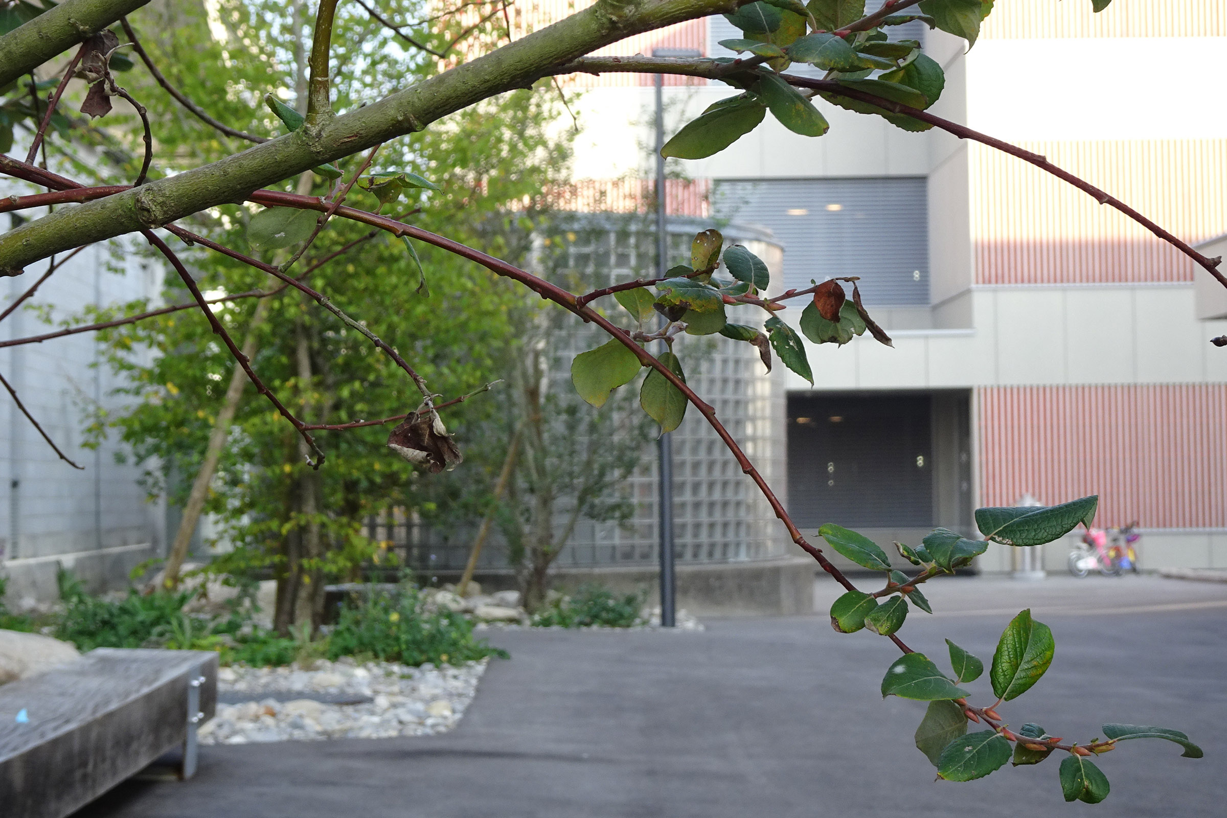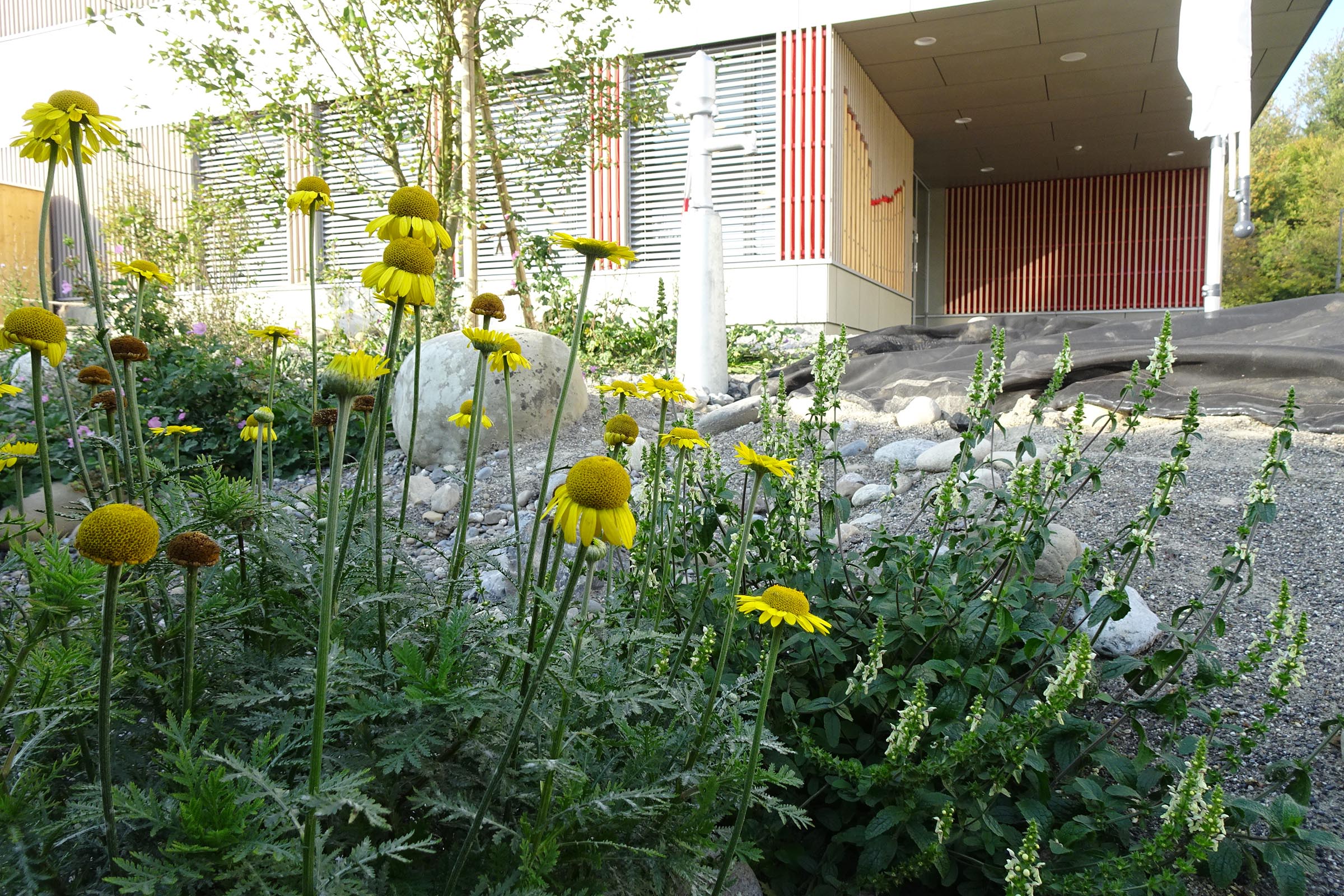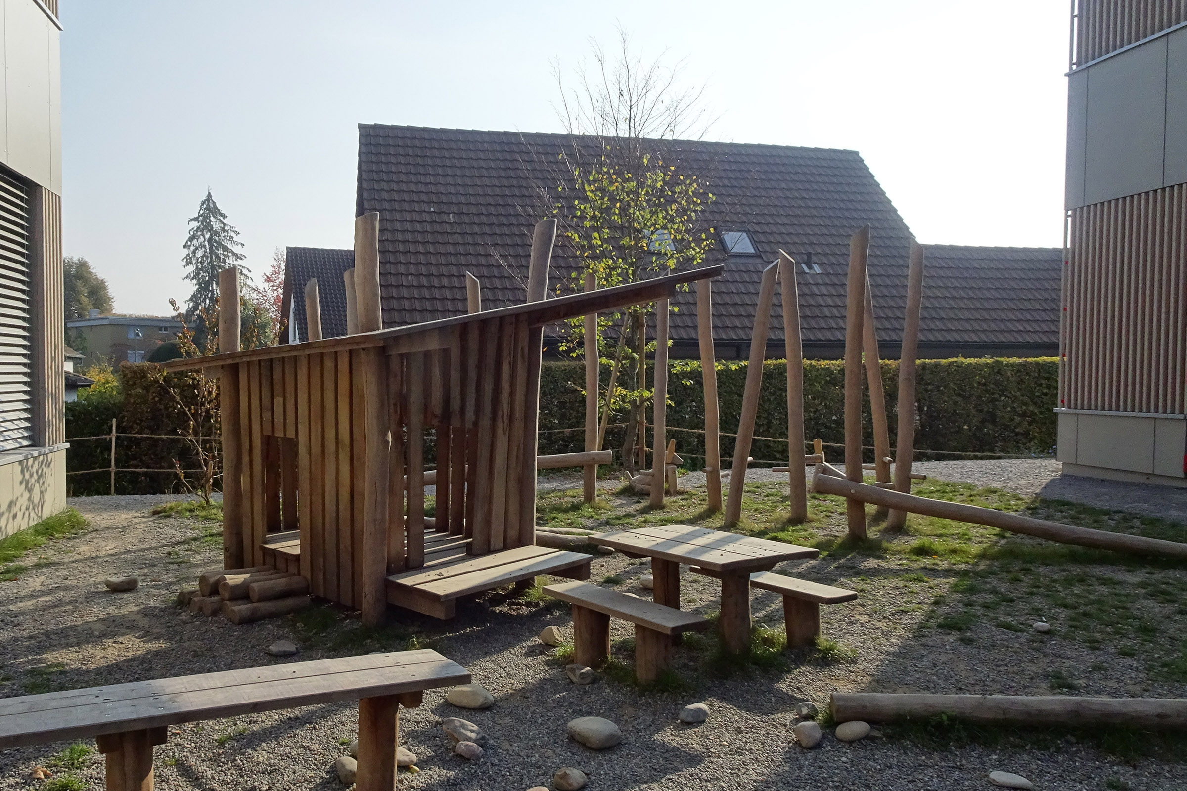 Der Aussenraum des Kindergartens bietet den Kindern Möglichkeiten für gärtnerische Arbeit, verschiedenen natürlichen Materialien wie Sand, Steine und Wasser ermöglichen ein offenes, kreatives Spiel. Die Kletter- und Balancierstämme zwischen den Neubauten werden von Kindern aller Altersstufen genutzt.