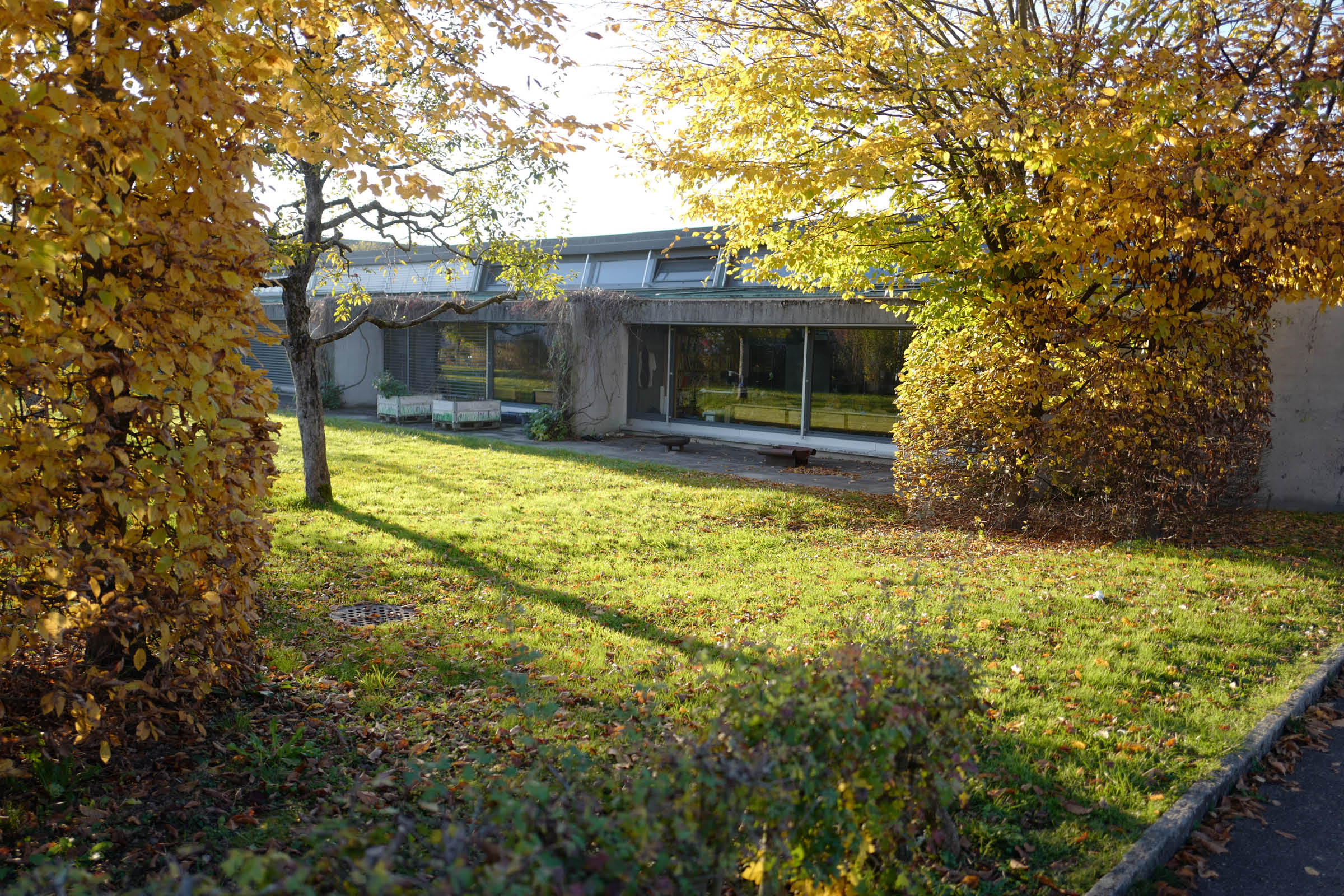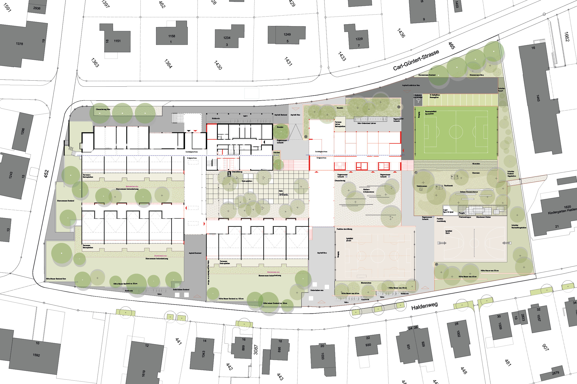 Die Anlage aus den 60er Jahren wird durch einen Neubau erweitert. Die bestehenden Bauten werden saniert. Durch diesen Eingriff in den Bestand kann die Umgebung im Sinne des starken Bestands neu konzipiert, bzw. weiterentwickelt werden. In der Mitte der Anlage entsteht ein Freiraum mit vielen Sitzgelegenheiten im Schatten der Baumkronen. In den freien Feldern entstehen neue Spielbereiche mit unterschiedlichen Inhalten. Der klassische Allwetterplatz wird ergänzt durch einen Kletterplatz, ein Aussenschulzimmer und ein Rasenspielfeld. Die strenge Struktur wird durch die lockere Anordnung der Vegetation zu einem stimmungsvollen Ganzen ergänzt.