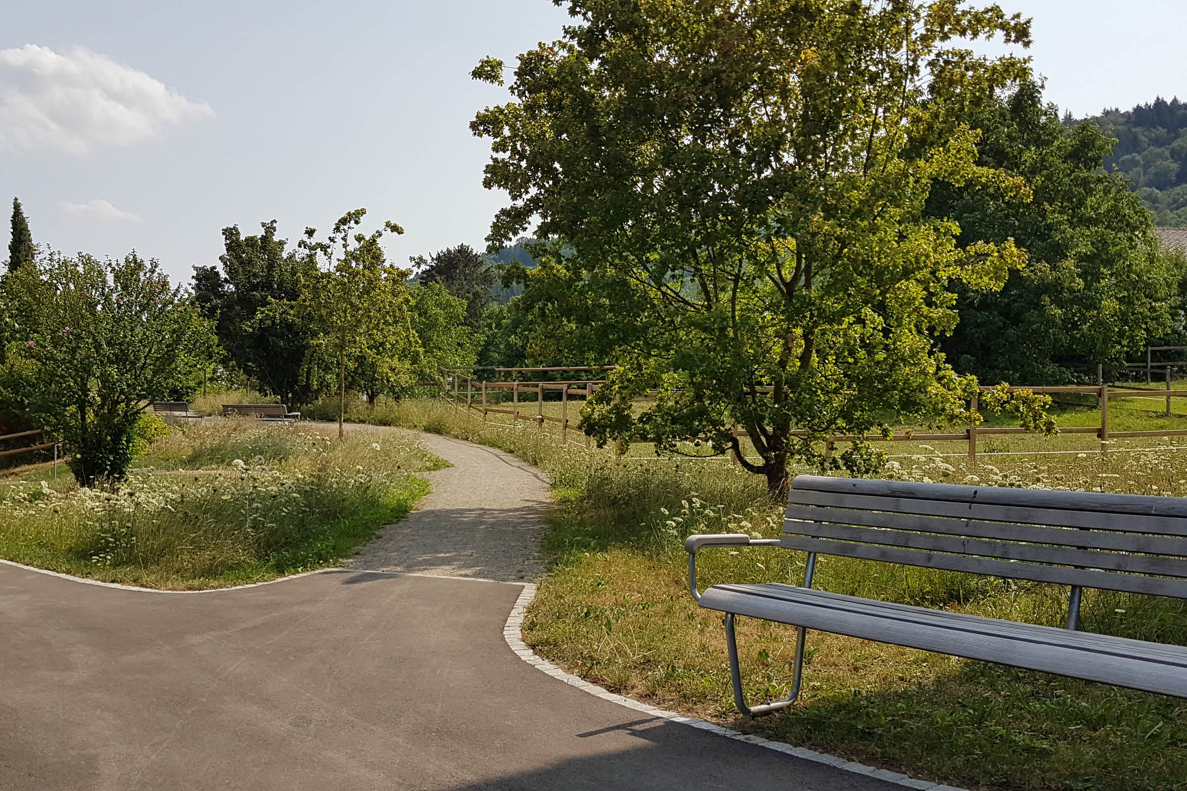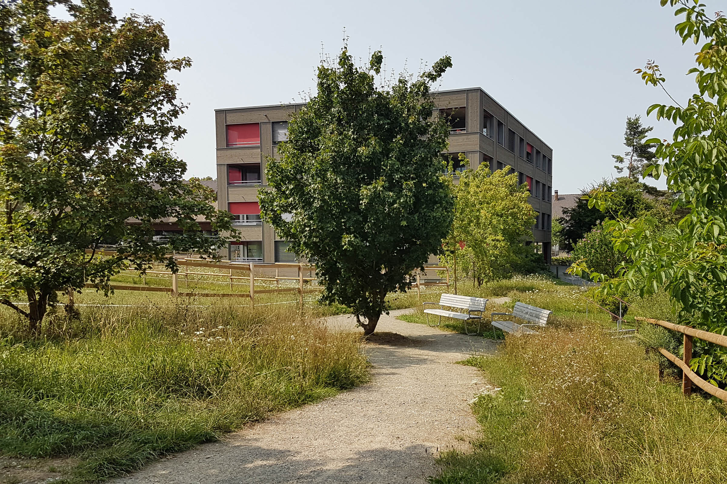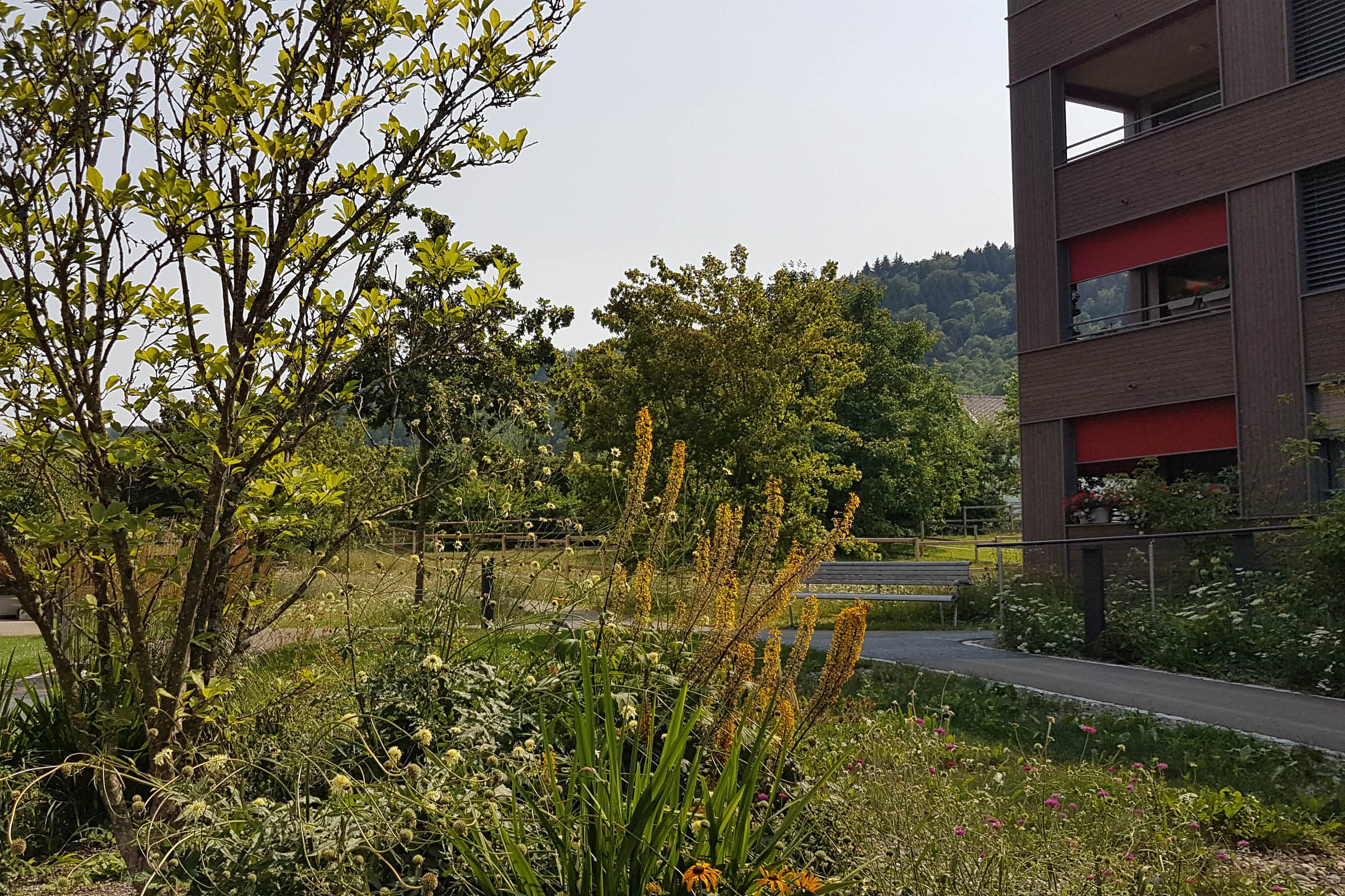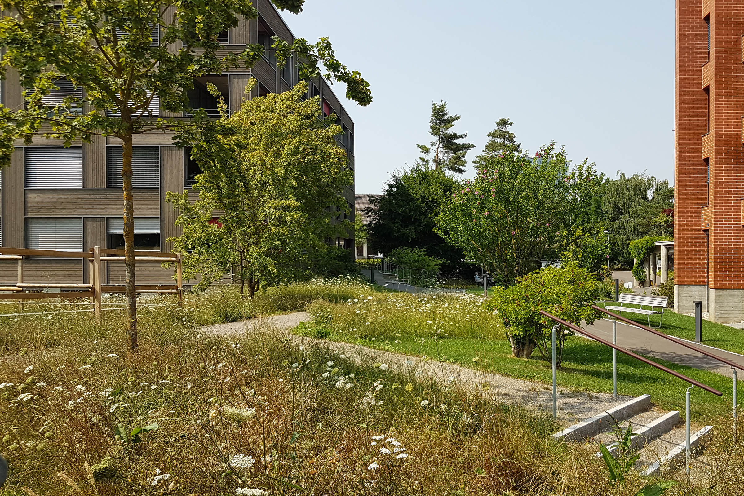Die bunten, in Gebäudenähe angelegten Staudenflächen ergeben einen sich jahreszeitlich verändernden Blütenregen, der auch aus den Innenräumen gut zu beobachten ist. Im Schatten von Bäumen und der begrünten Pergola sind gemütliche Sitzbereiche entstanden mit Aussicht Richtung Dorfzentrum und bewaldetem Hang vom Heitersberg.