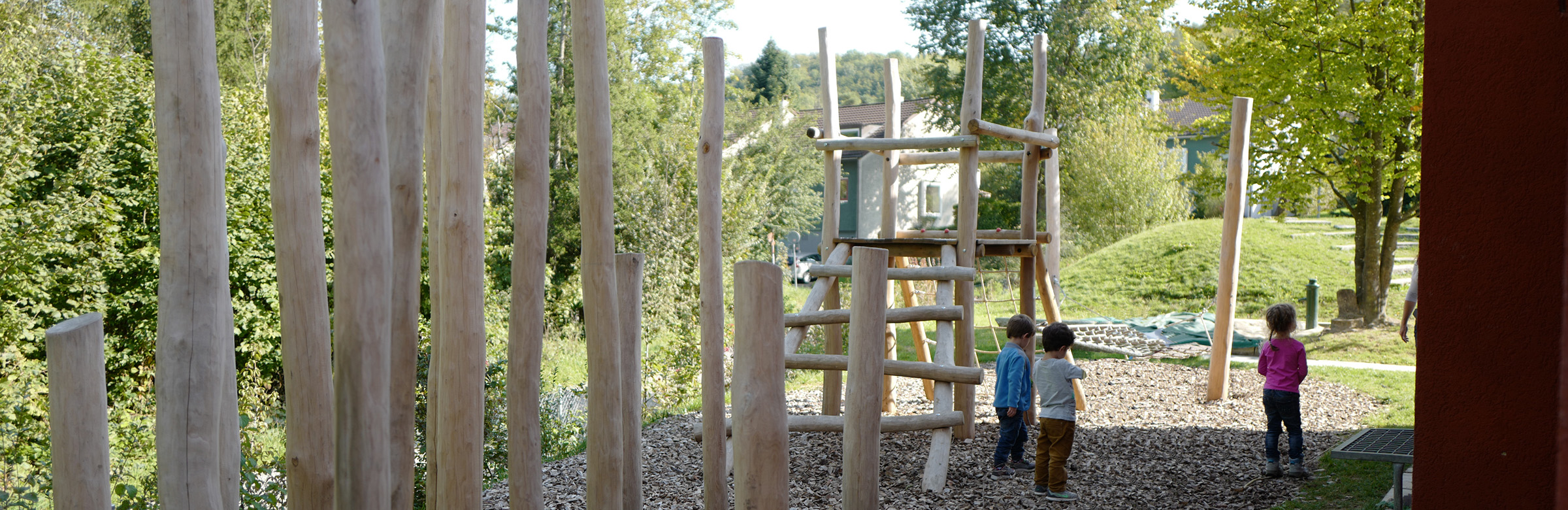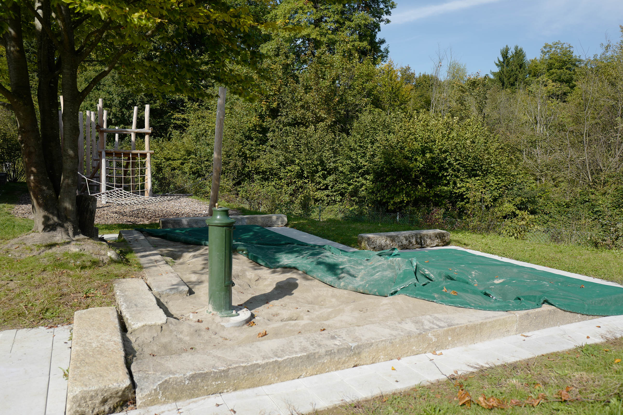 Dem Erweiterungsbau musste ein Teil des Gartens weichen. Die stimmige Anlage aus dem Jahr 1966 war geprägt von der Topographie, die von Gneisstufen gehalten war, sowie von unterschiedlichen Belagsarten und –formaten. Die Neugestaltung suche eine Kontinuität in der Formensprachen und der Materialität. Aus den Gneisstufen entstand ein grosszügiger Sandkasten mit Sitzbalken, die übergehen in die Sitzarena. Die bestehenden, grossformatigen Betonplatten wurden wieder verlegt in einem Verbund mit neuen Platten unterschiedlichen Formaten. Der Vorplatz geht nahtlos in den Zugangsweg über. Die Robinienstämme des Spielplatz nehmen Bezug zum angrenzenden Wald, eine Wildhecke fasst das Grundstück zum Wald hin ein und gibt dem Garten Halt.