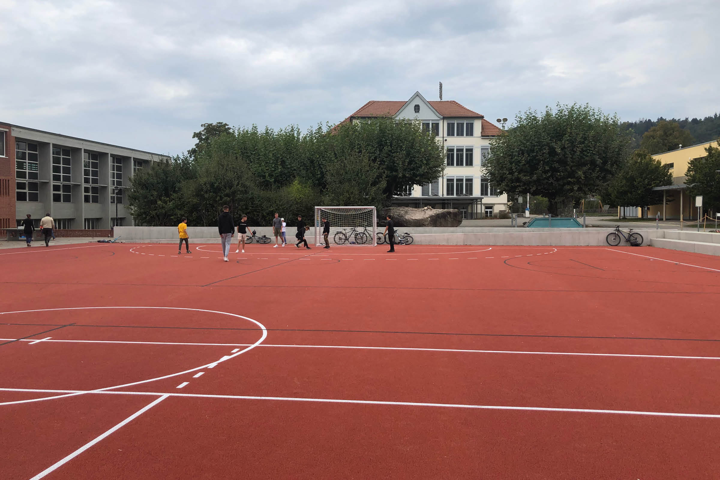 Der bestehende Allwetterplatz, zugleich Sportplatz für die Schule und Pausenplatz, war zu klein geworden und in die Jahre gekommen. Mit der Vergrösserung konnten entlang des neuen Platzes Sitzstufen wie auch eine neue Fussverbindung zwischen der Schule und der höher gelegenen Sporthalle realisiert werden.