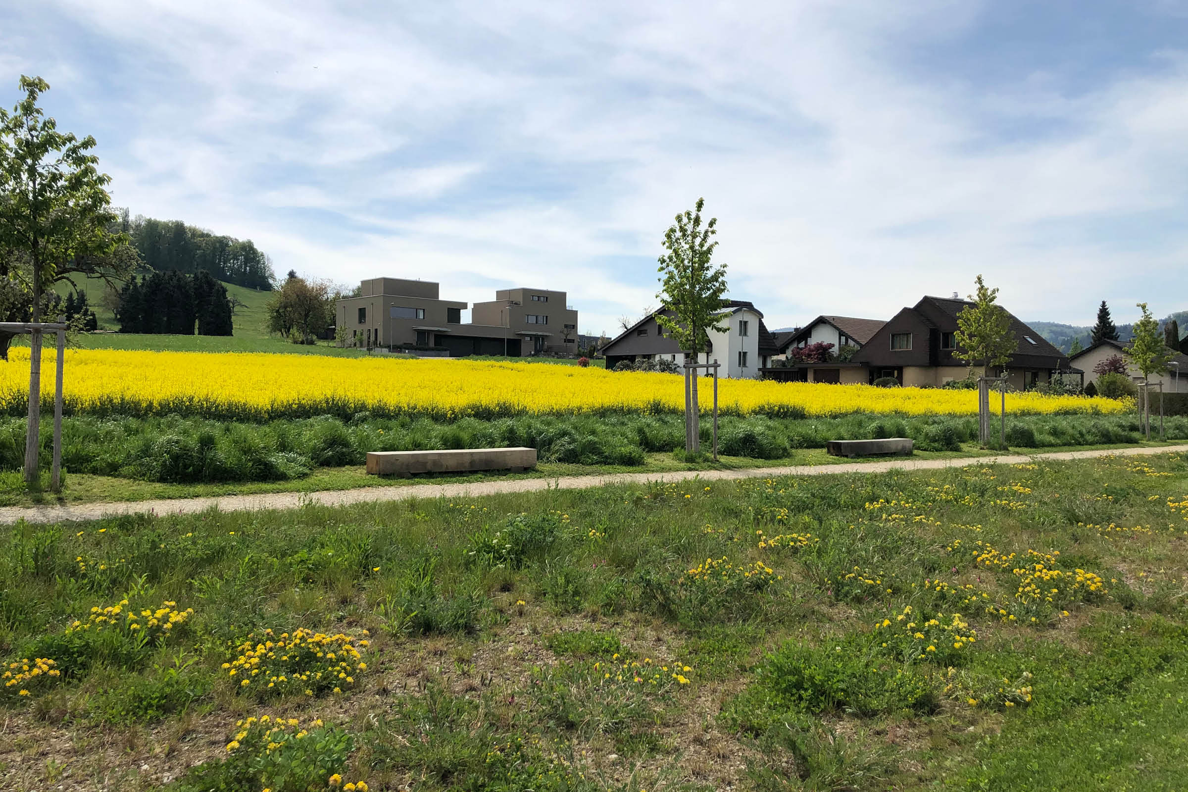 Dem Bauprojekt vorangegangen waren eine Analyse sowie ein Konzept über die Schul- und Sportanlagen der Gemeinde Würenlos. Die Platzierung der neuen Laufbahn folgte dem Konzept. Zwischen Sportfeld und Ackerfläche im Hang liegend, erforderte die Planung der Lage und der Höhenverhältnisse besondere Aufmerksamkeit. Die auf Rohboden angesäte Blumenwiese packt die Laufbahn farbenfroh ein.