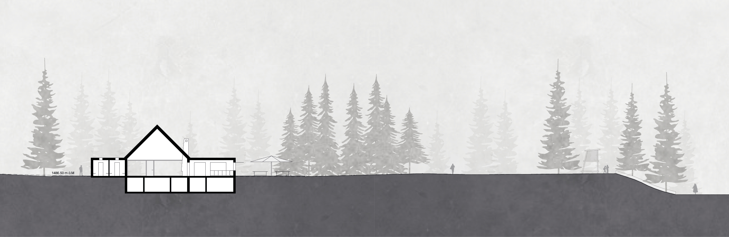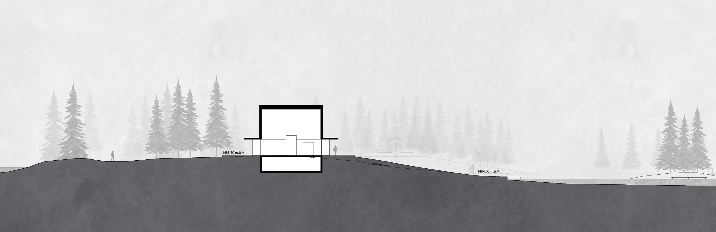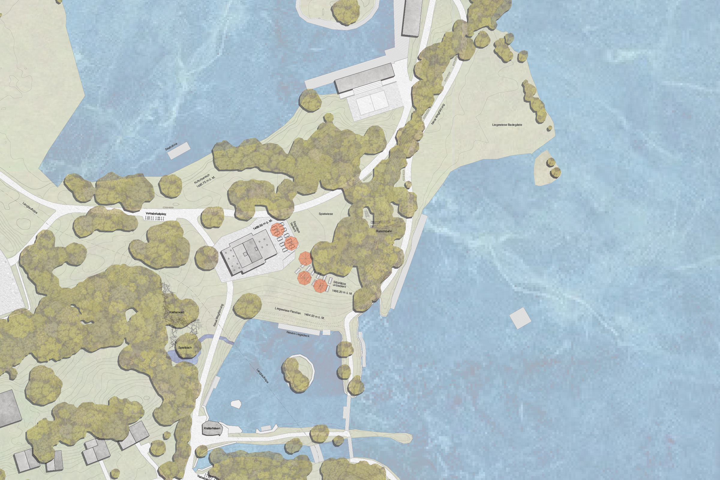 Das Umfeld des Lido ist eine Postkartenlandschaft im besten Sinne. Wenige starke Elemente – ein herrliches Bergpanorama, ein malerischer See, Wiesen, Baumgruppen und Wald – machen den Ort aus. In diesem Sinne der Reduktion auf das Wesentliche setzt der Entwurf die Idee der Postkartenlandschaft um. Der Neubau und die Freiraumgestaltung stellen die Landschaft ins Zentrum und vereinfachen sie wieder auf ihre zentralen Qualitäten. Das drückt sich vor allem in zwei grundlegenden Entscheidungen aus: In der Platzierung des Restaurants auf dem erhöhten Sattel. Und in einer Freiraumgestaltung, die auf Weite und visuelle Ruhe setzt und all ihre Elemente aus der Landschaft heraus entwickelt.