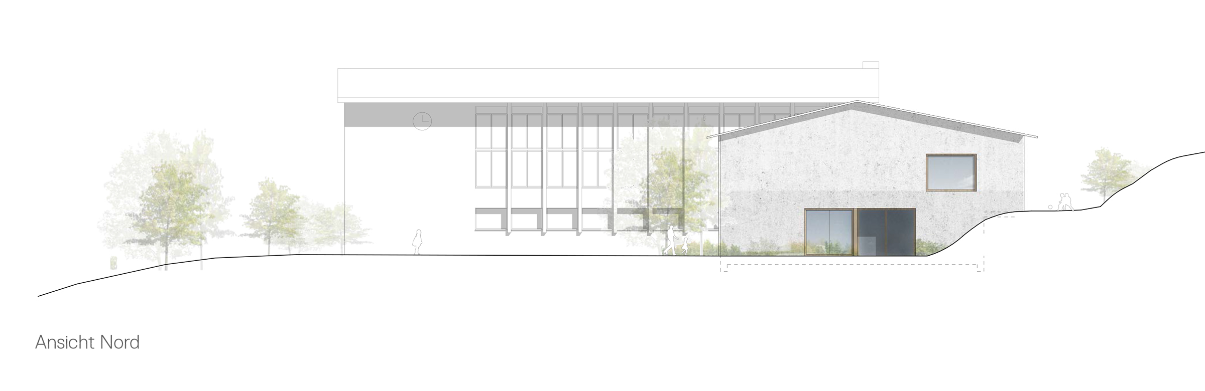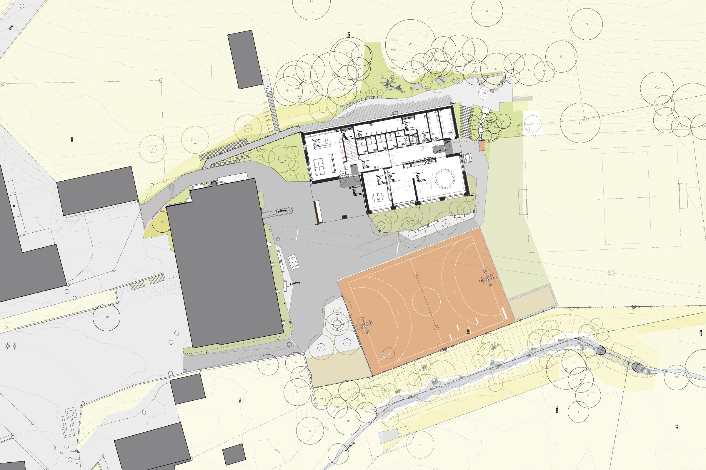 In Ergänzung zu der bestehende Turnhalle entsteht ein Schulhausneubau für Primarschüler. Die städtebauliche Setzung wird durch die Landschaft geprägt, der sanft geneigte Hang mit der eingeschobenen Ebene ist die Basis.
