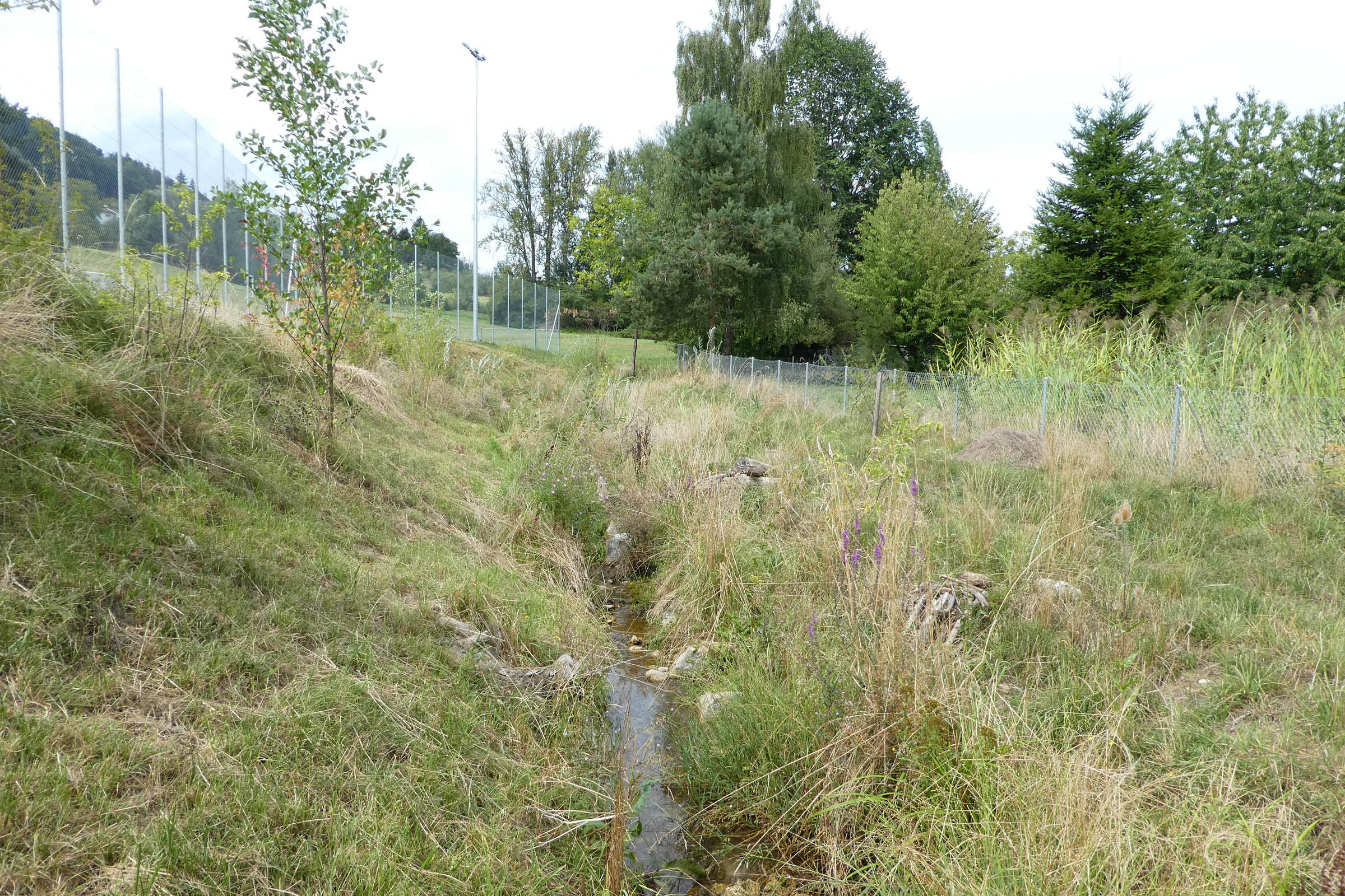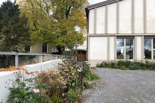 Der Aussenraum des Kindergartens ist ein wilder Naturraum, der mit seinem ruderalen Bewuchs, der verspielten Topografie und unkonventionellen, naturnahen Spielgeräten zu kreativem Spiel einlädt. Gleichzeitig bildet er den Übergang zu den angrenzenden Landwirtschaftsflächen.
