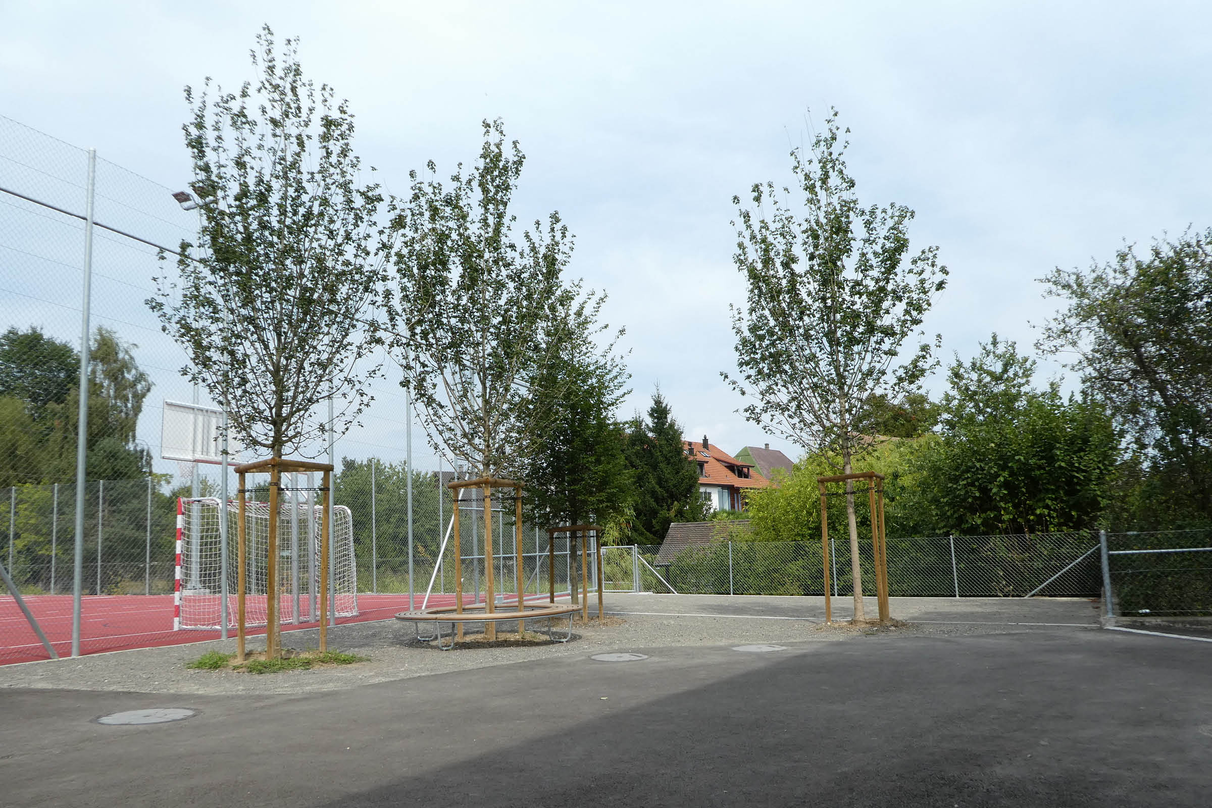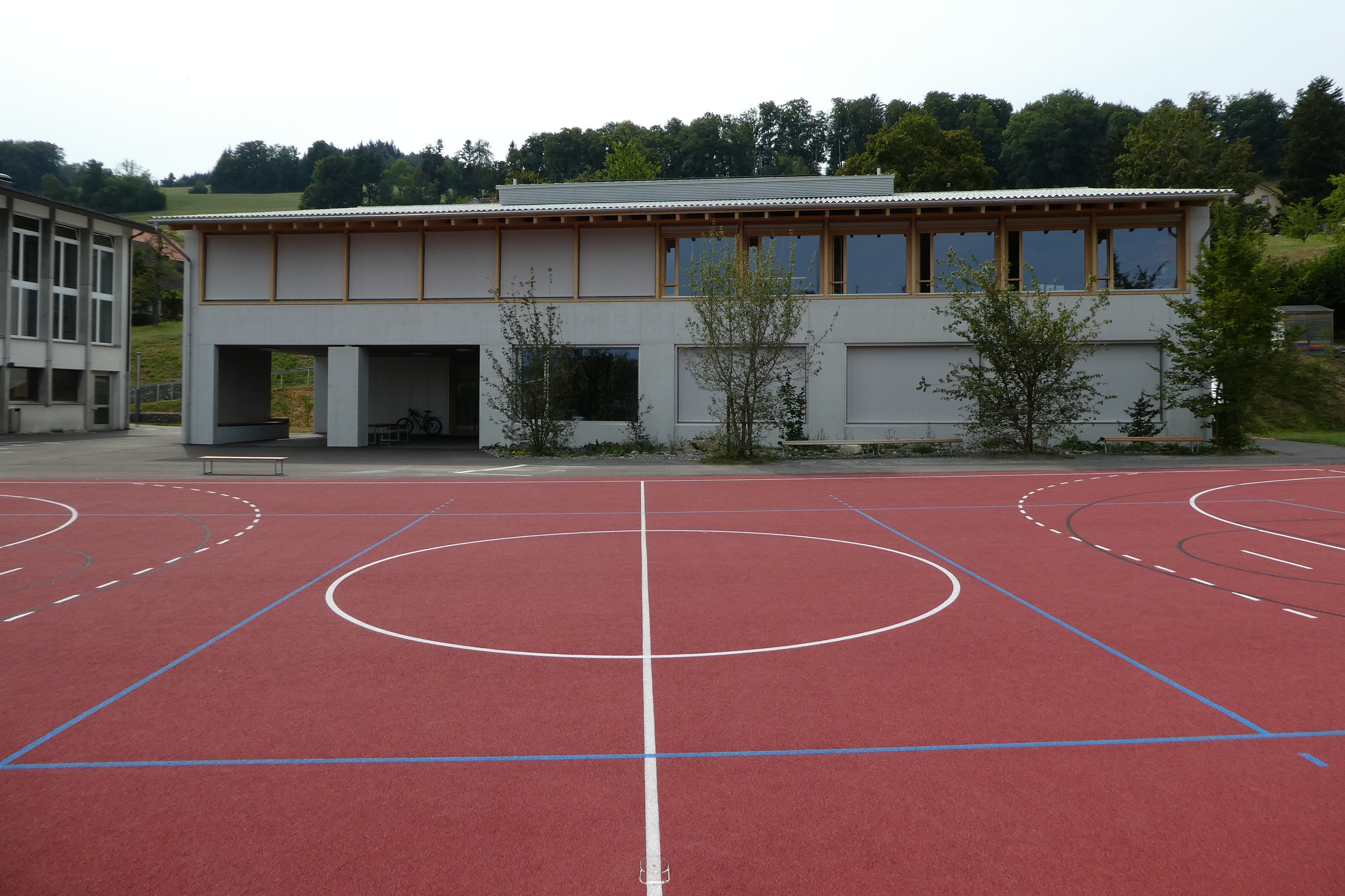 Der Vorplatz der bestehenden Turnhalle bildet den Auftakt. Ein Weg führt entlang des Gebäudes auf den neuen Pausenplatz, der als Patchwork an unterschiedlich nutzbaren Flächen die bestehende Turnhalle mit dem Neubau verbindet. Der an beiden Gebäuden angrenzende Asphaltplatz in Gebäudenähe bildet den Kern der Anlage. Ein längs orientierter Allwetterplatz und die bestehenden Sportanlagen ergänzen den Pausenraum. Sitzelemente bieten während der Pause Orte zum Austauschen, Beobachten, Entspannen und Bewegen.