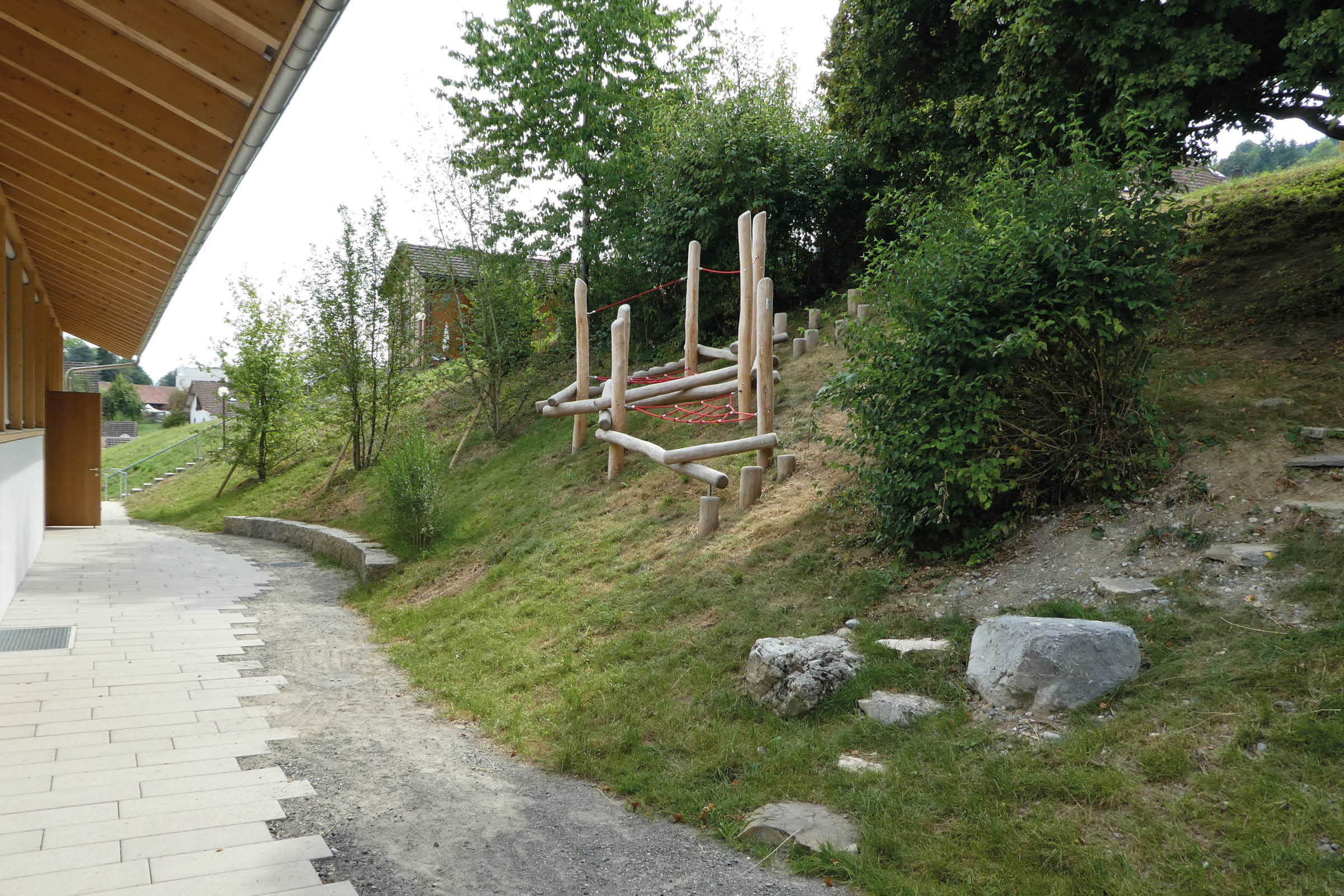 Bergseitig des Neubaus befindet sich ein grünes Klassenzimmer, das insbesondere bei heissen Temperaturen als lauschigen Rückzugsort dient.