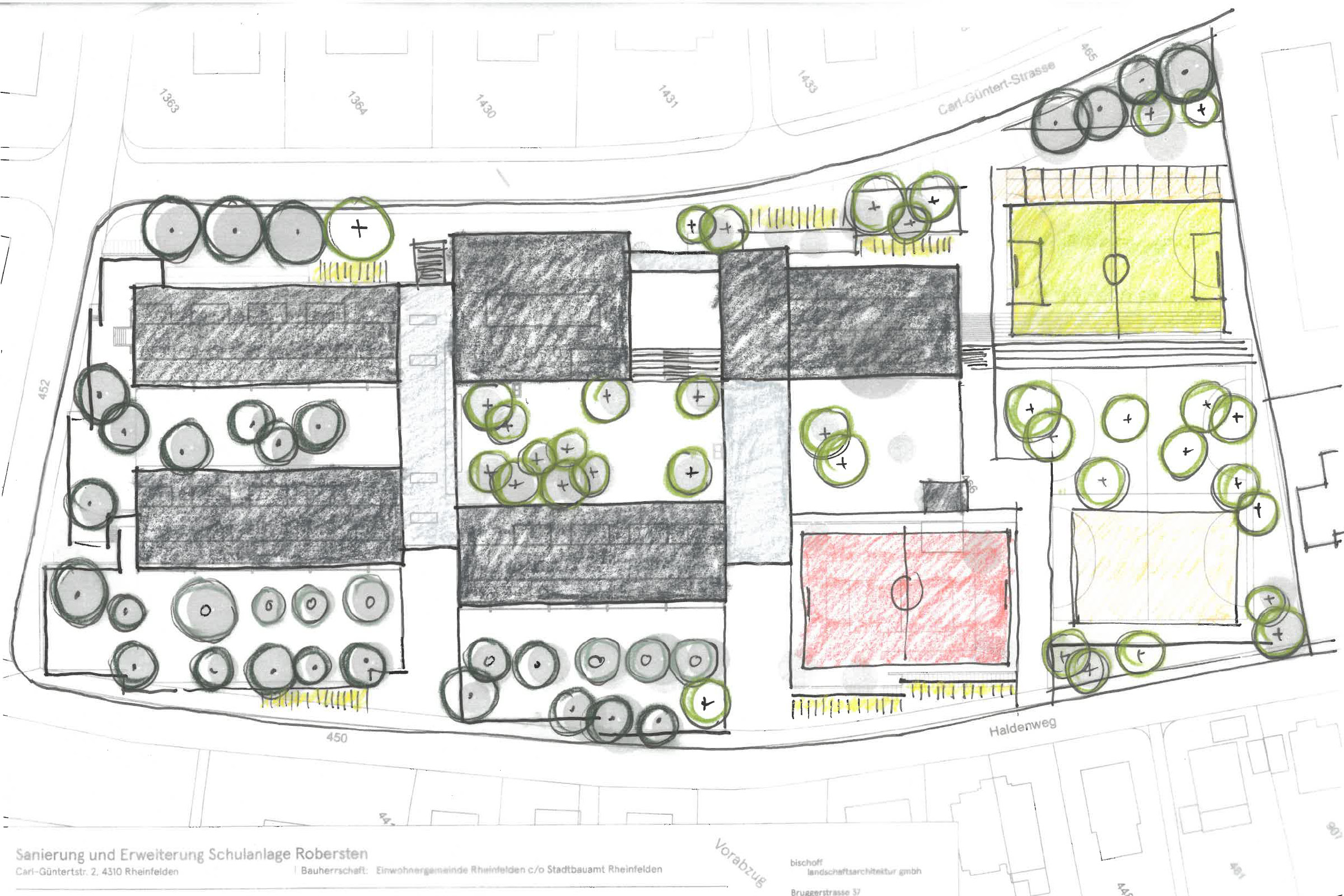 Die Anlage aus den 60er Jahren wird durch einen Neubau erweitert. Die bestehenden Bauten werden saniert. Durch diesen Eingriff in den Bestand kann die Umgebung im Sinne des starken Bestands neu konzipiert, bzw. weiterentwickelt werden. In der Mitte der Anlage entsteht ein Freiraum mit vielen Sitzgelegenheiten im Schatten der Baumkronen. In den freien Feldern entstehen neue Spielbereiche mit unterschiedlichen Inhalten. Der klassische Allwetterplatz wird ergänzt durch einen Kletterplatz, ein Aussenschulzimmer und ein Rasenspielfeld. Die strenge Struktur wird durch die lockere Anordnung der Vegetation zu einem stimmungsvollen Ganzen ergänzt.