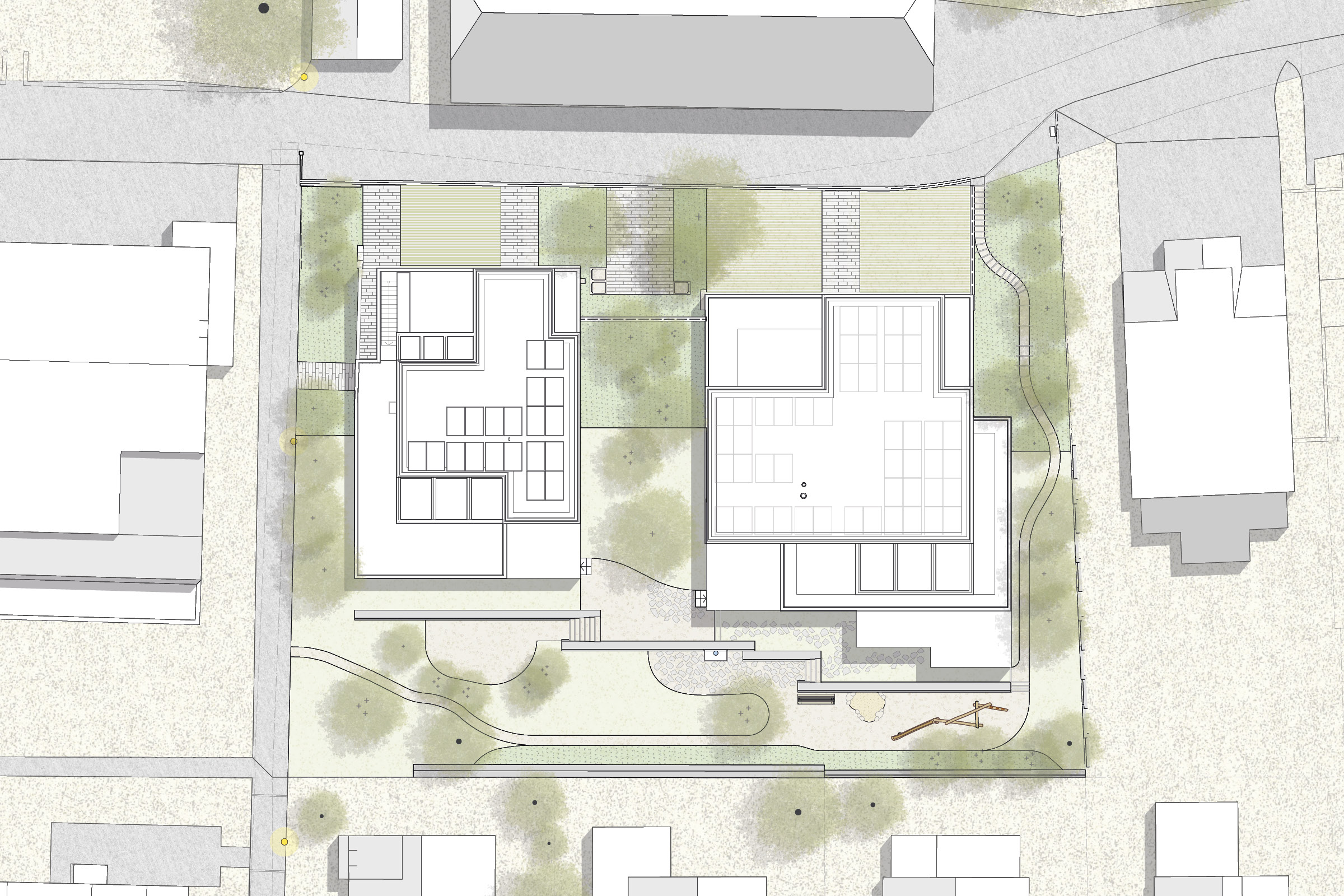 Am Wettinger Südhang der Lägeren entstehen auf zwei Grundstücken zwei Mehrfamilienhäuser. Der gemeinsame Garten umschliesst die beiden Häuser und wird zum Ort der Begegnung.